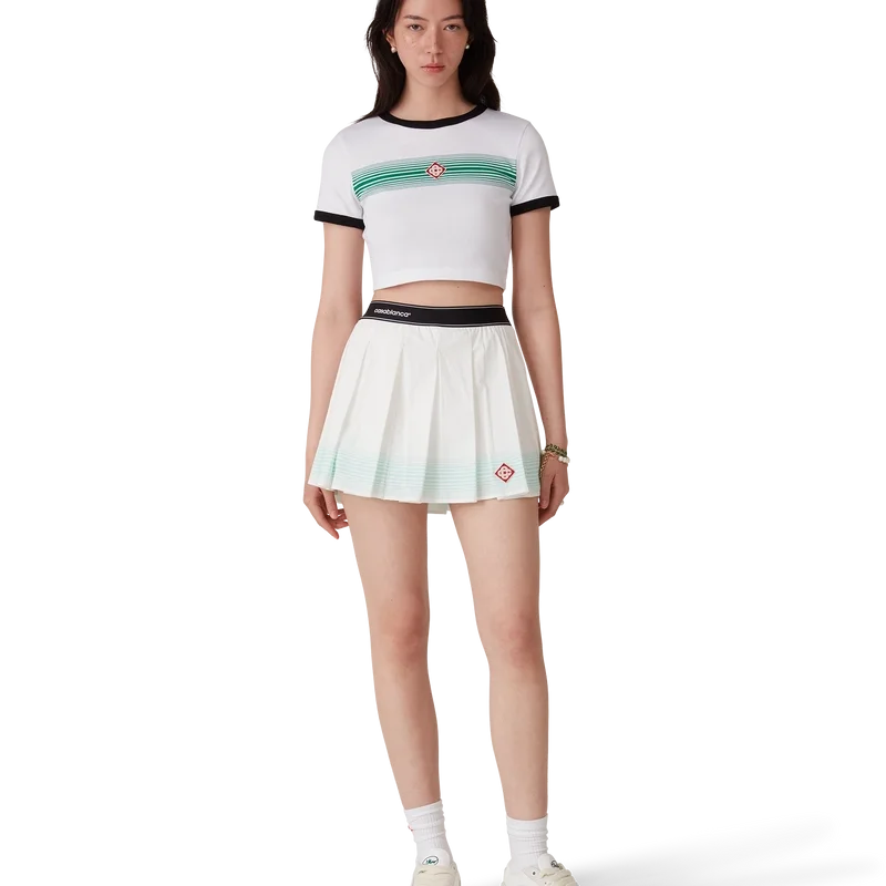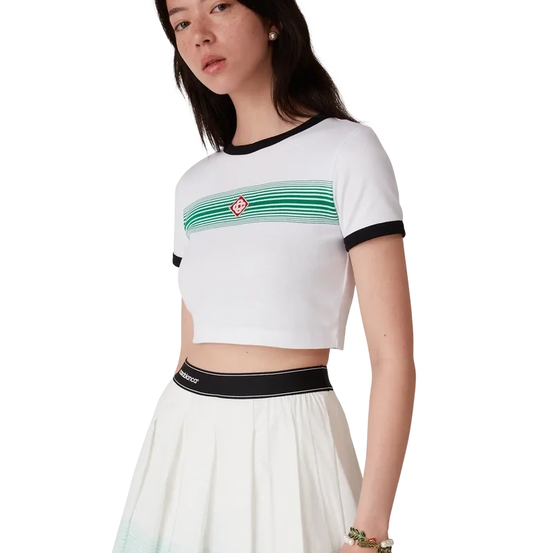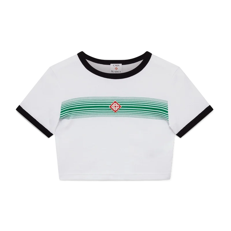 La T-shirt a righe sfumate con bordo a contrasto è un modello aderente con l’applicazione del logo a diamante della Maison. Realizzata in tessuto di cotone e rifinita con un classico girocollo e collo e polsini a costine a contrasto.