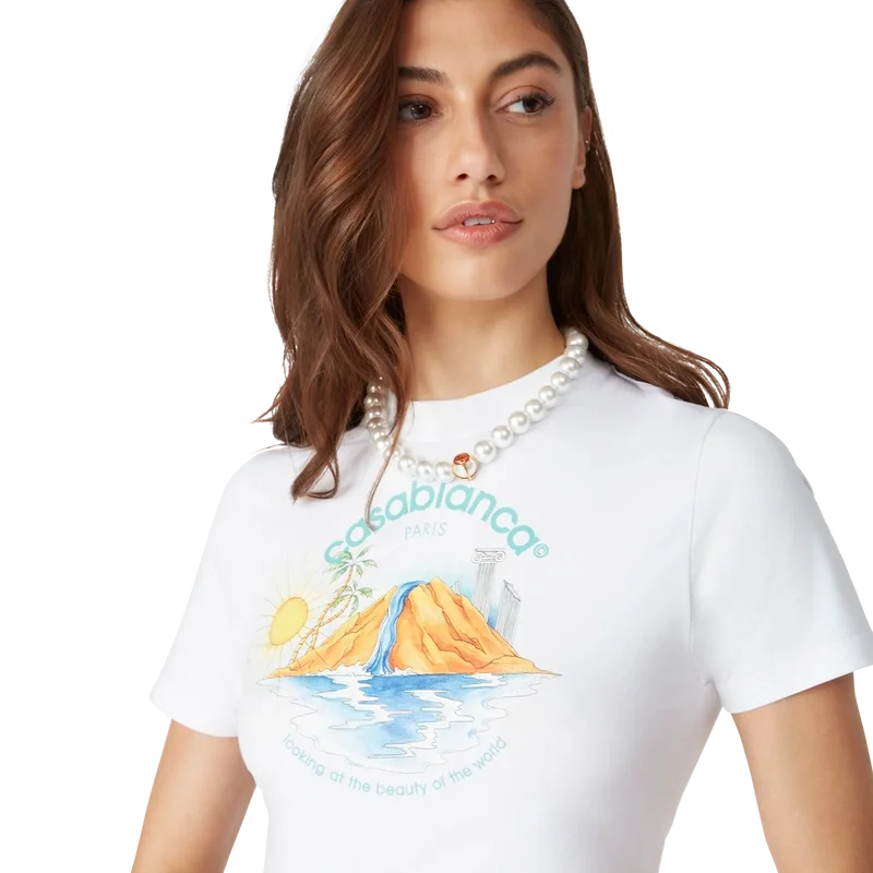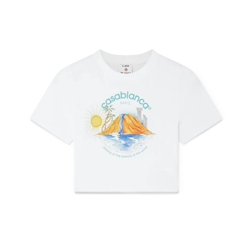 La T-shirt corta Oasis è un modello a maniche corte stampato, realizzato in tessuto di cotone biologico, che presenta la grafica stagionale della Maison con elementi di design ispirati alla natura, all’architettura e al tennis. Completata da un classico girocollo. Progettata per arrivare sopra l’ombelico.