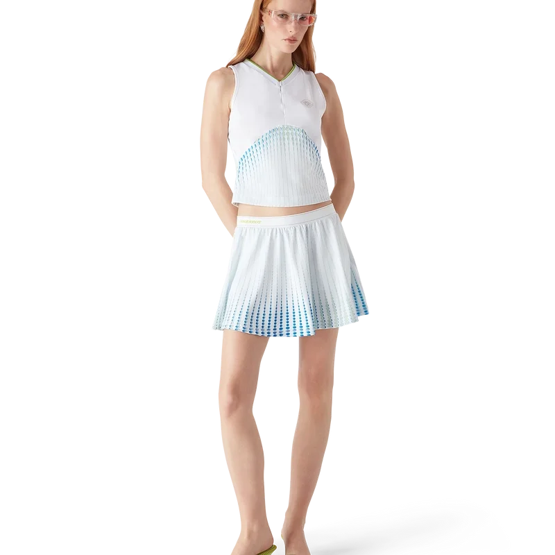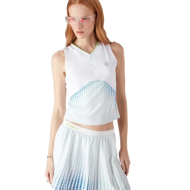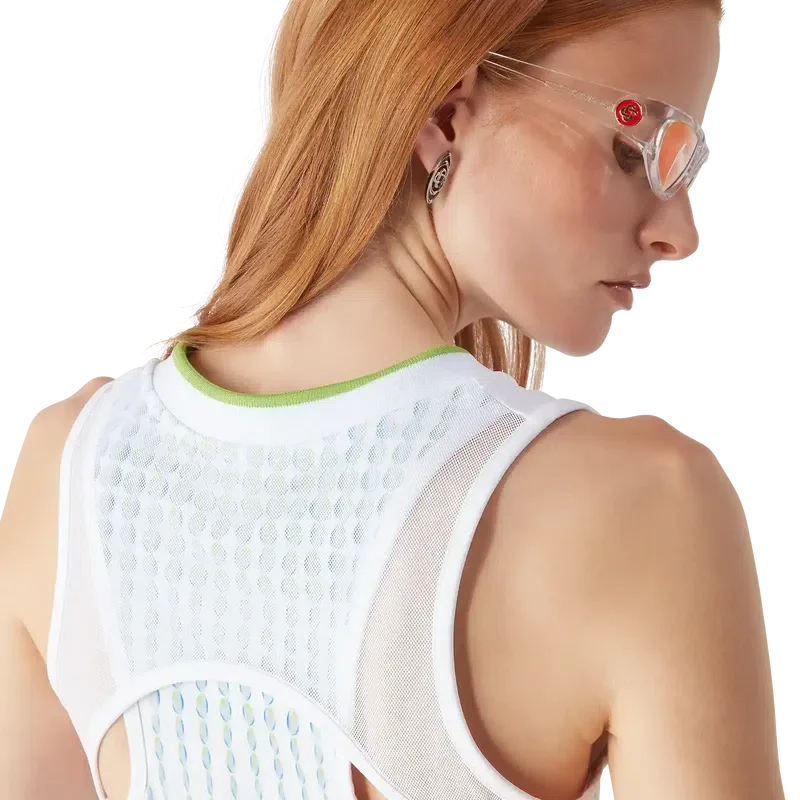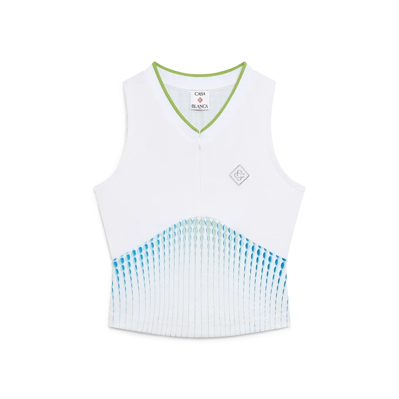 La maglietta jacquard Tennis Jointed è un modello senza maniche con il logo Diamond argentato della Maison. Caratterizzata da uno scollo a V poco profondo a contrasto, chiusura con zip, corpetto stampato e silhouette slim.