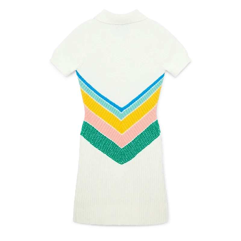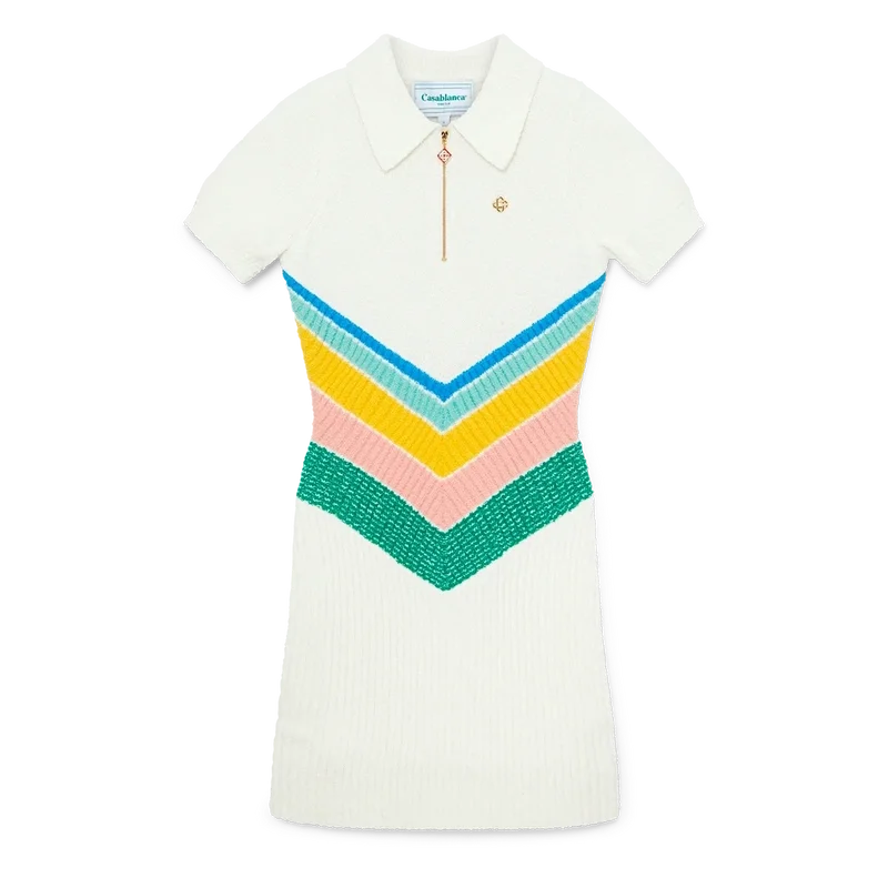 L’abito Boucle Chevron è un modello mini aderente a maniche corte, realizzato in tessuto bouclé. Rifinito con il logo a rombi iconico della Maison, chiusura con cerniera sul collo, motivo chevron multicolore sul corpetto con i colori pastello di questa stagione, colletto e pannello della gonna in bouclé a coste.