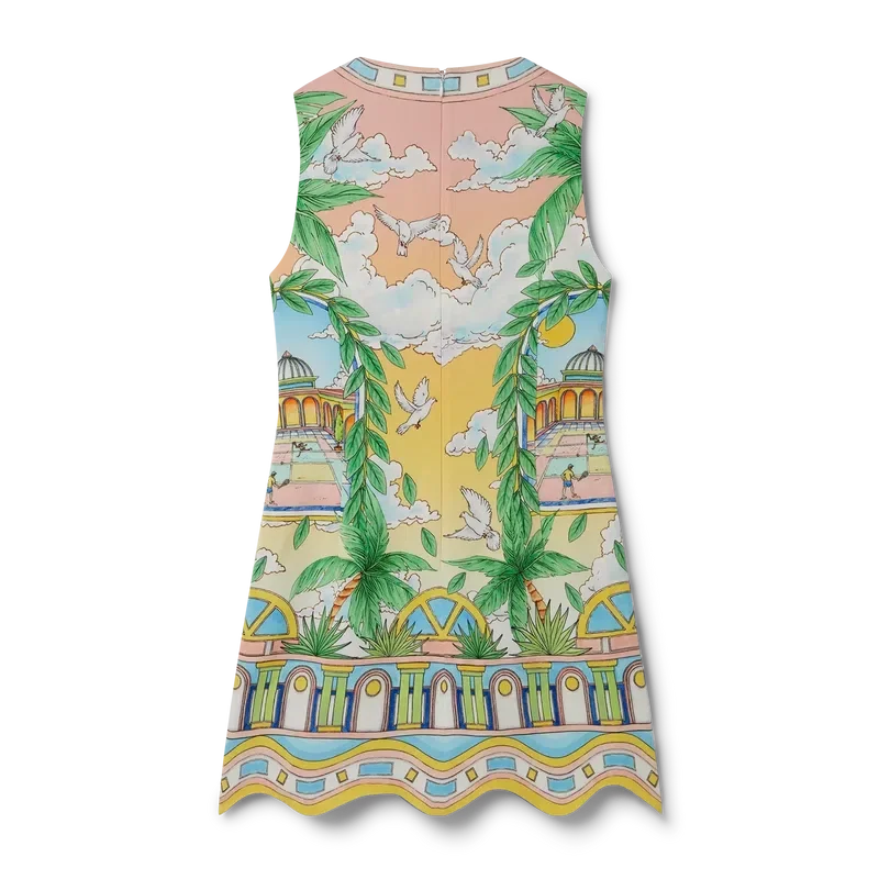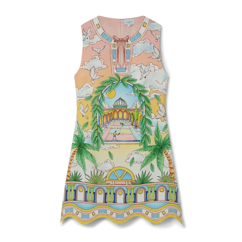 L’abito da cocktail Paysage Ideal è un miniabito senza maniche dalla silhouette ad A, caratterizzato da una grafica stagionale con un layout tradizionale che mette in risalto l’arco, la simmetria e l’universo ideale di Casablanca, con una palette di colori chiari e idealistici che enfatizzano i temi eterei fondamentali del nostro marchio. Completato da chiusura con zip sul retro, scollo a V e dettagli sull’orlo ispirati alla Memphis Wave, uno degli elementi di design fondamentali del nostro marchio.