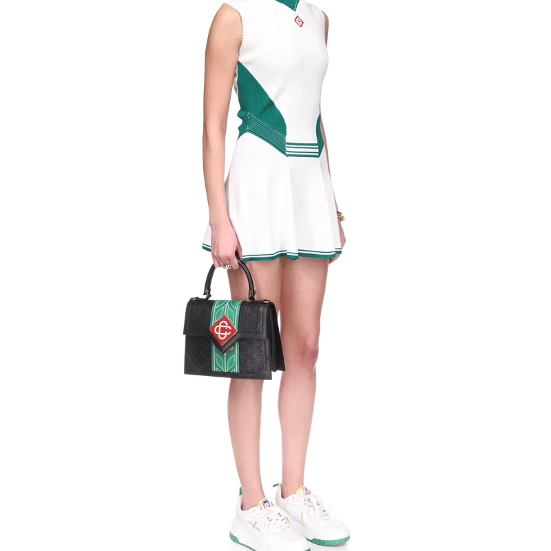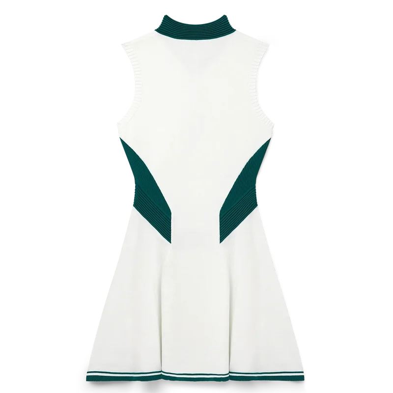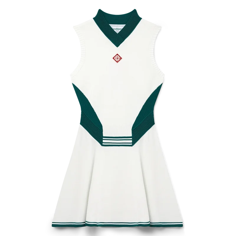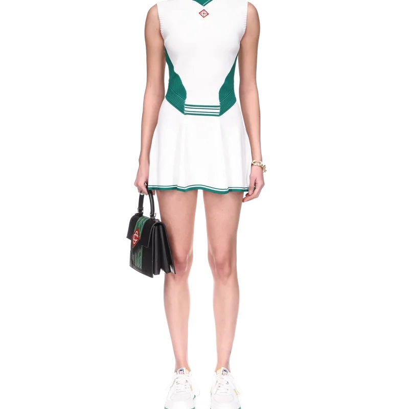 L’abito da tennis drappeggiato è un modello senza maniche con scollo a V profondo ispirato al tennis e realizzato in tessuto a maglia con il logo a diamante iconico della Maison sul petto. Caratterizzato da corpetto aderente, vita bassa, gonna a pannelli con orlo a contrasto, dettagli a costine a contrasto su colletto, pannelli laterali e cintura.