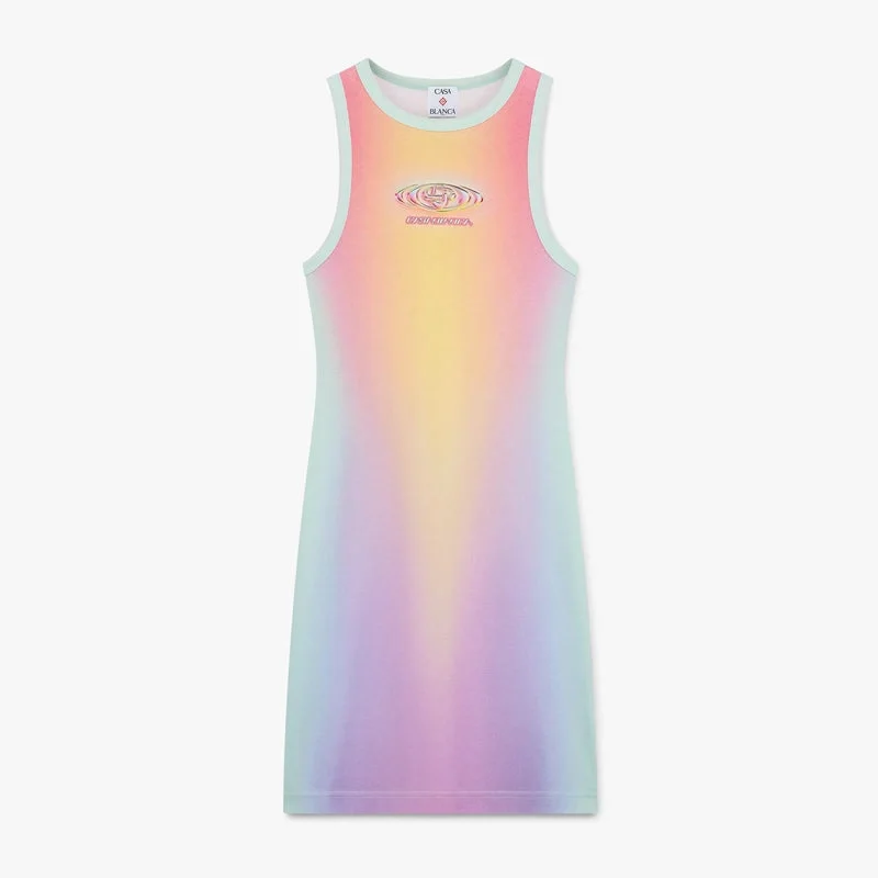 L’abito lungo senza maniche con effetto vetro sfumato presenta un design raffinato, caratterizzato dalla grafica stagionale con effetto vetro sfumato creata in collaborazione con Martin Naumann, noto per il suo lavoro con sfumature ed effetti materici, mezzitoni ed effetti simili al vetro. Completato da scollo rotondo, silhouette senza maniche, logo Warped della Maison e logo Casablanca con effetto vetro sul davanti.