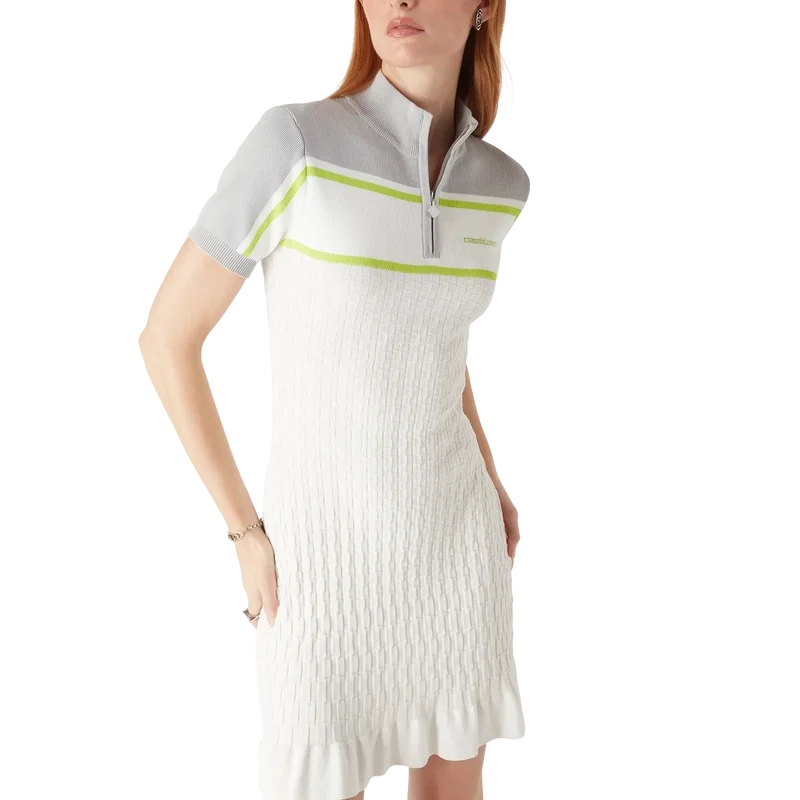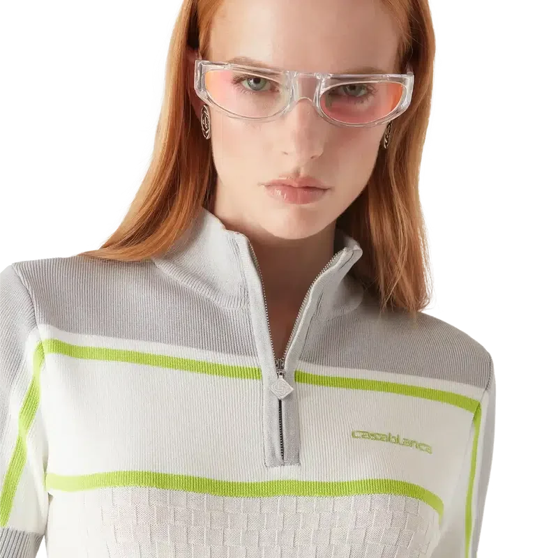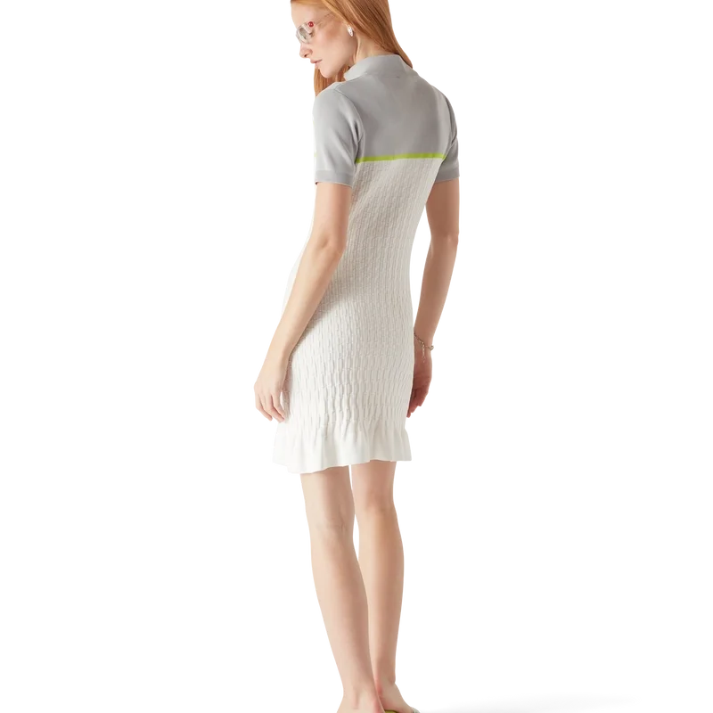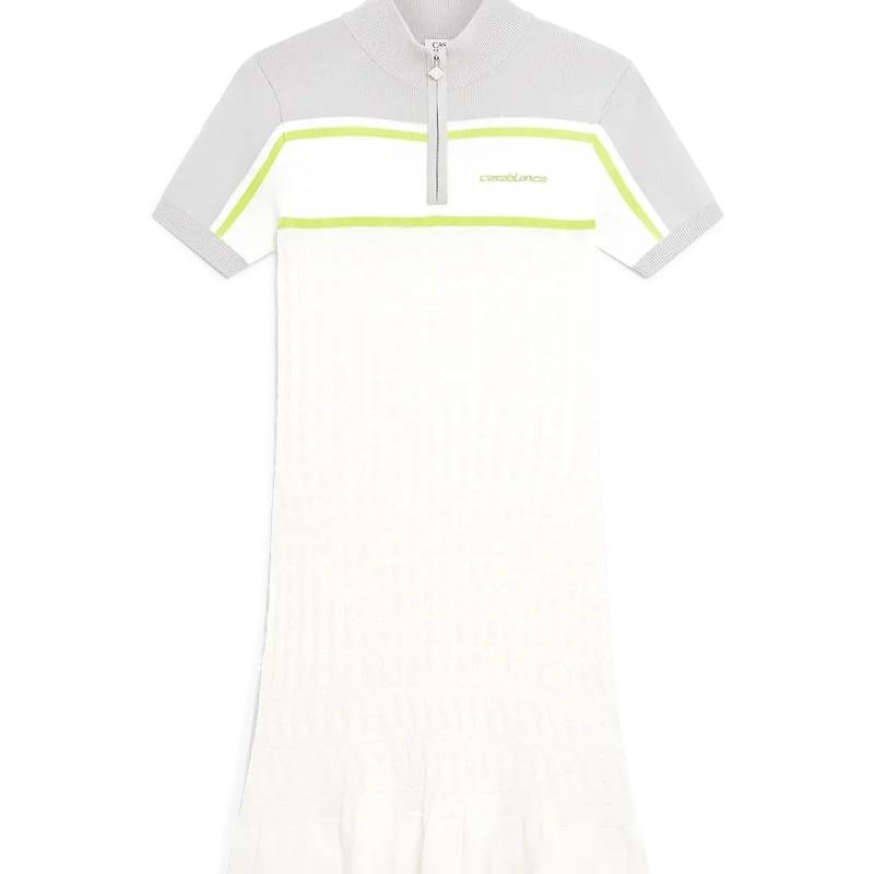 L’abito polo da tennis è un modello in maglia a maniche corte caratterizzato da spalle e maniche esterne a contrasto. Rifinito con chiusura a zip con linguetta con il logo a diamante della Maison, collo alto, dettagli a righe, logo Casablanca, polsini a costine e orlo con volant.