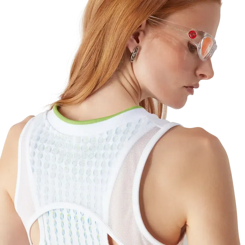 L’abito Racer è un modello senza maniche con stampa che presenta al centro il logo Silver Diamond della Maison, caratterizzato da un’opera d’arte creata in collaborazione con Martin Naumann, noto per il suo lavoro con sfumature ed effetti di texture. Completato da uno scollo a V poco profondo a contrasto, un pannello sul petto bianco e un corpetto stampato.