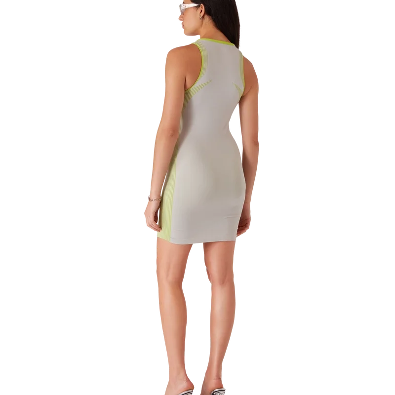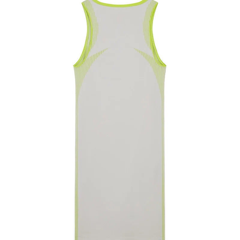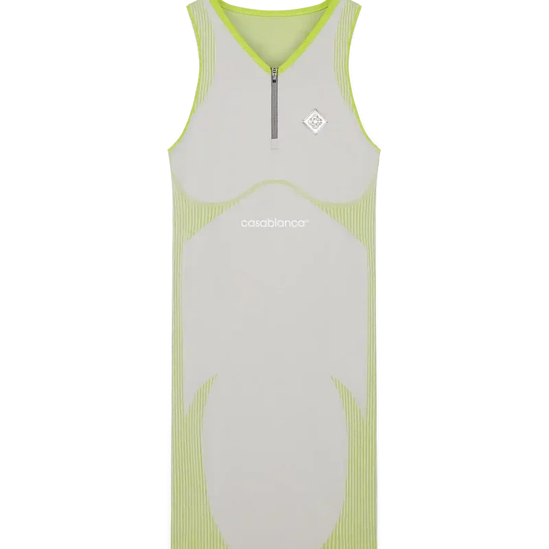 L’abito senza cuciture è un modello aderente senza maniche che presenta il logo a diamante argentato della Maison e il logo Casablanca al centro. Completato da una scollatura a V poco profonda, una chiusura con cerniera caratterizzata dalla linguetta a diamante distintiva della Maison e dettagli a pannelli per un maggiore sostegno.