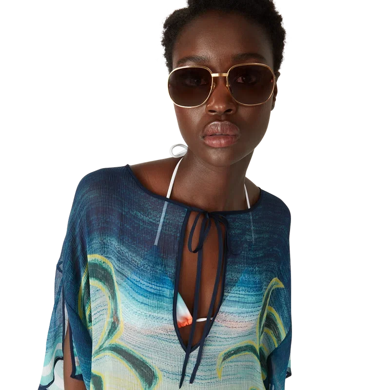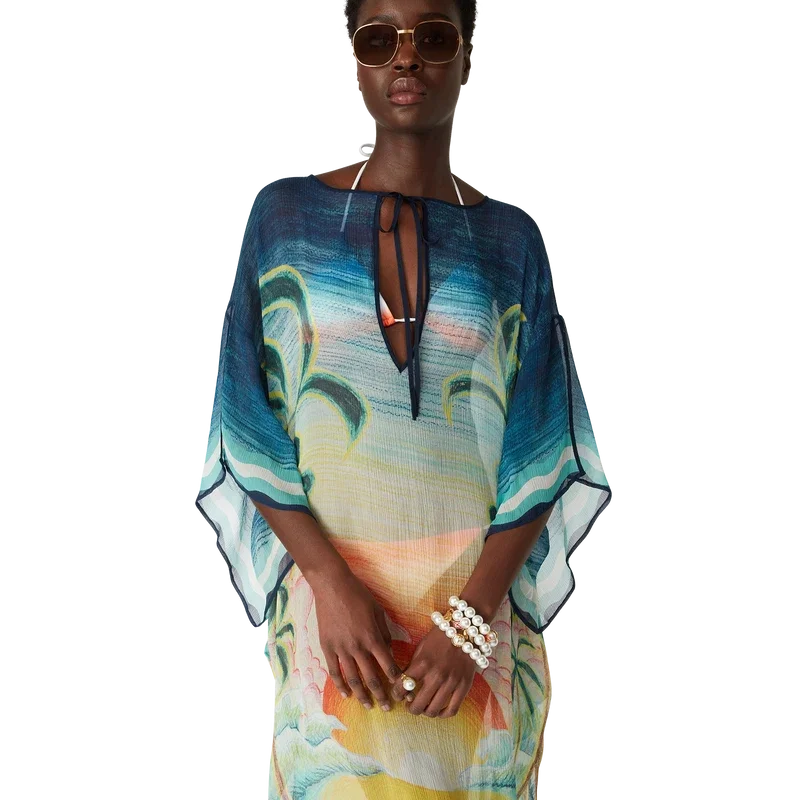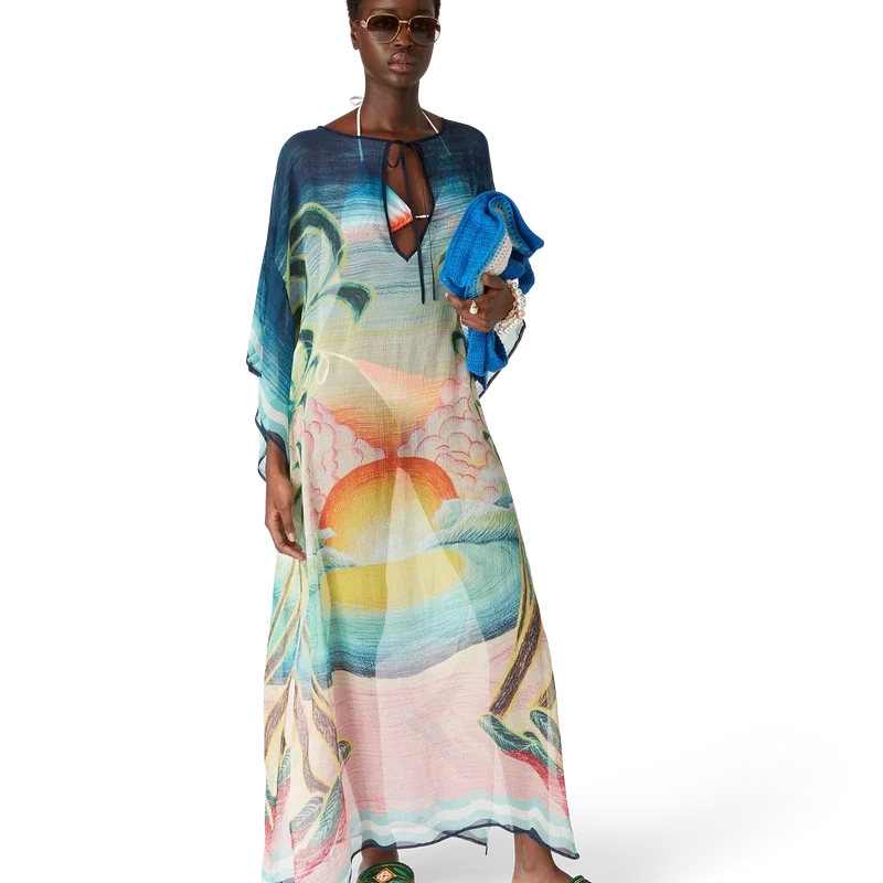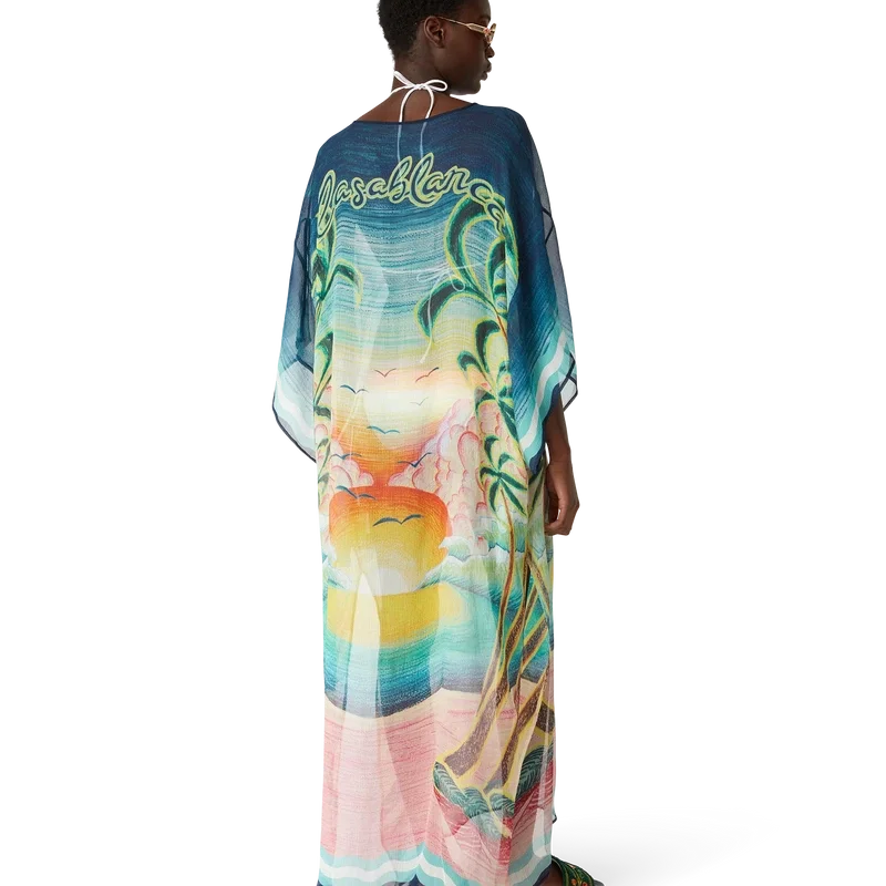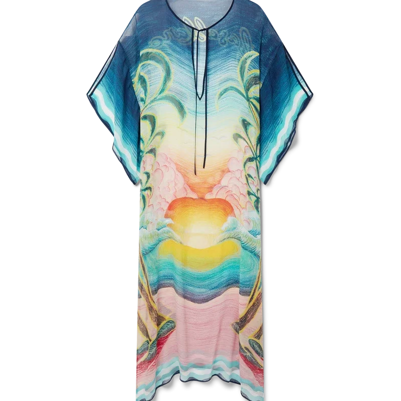 Il caftano Danse De La Mer è un modello leggero dalla vestibilità ampia, realizzato in tessuto di seta stampato con scene dipinte a mano create appositamente per la collezione. Caratterizzato da maniche larghe, spacchi laterali e scollo a V con chiusura a laccio.