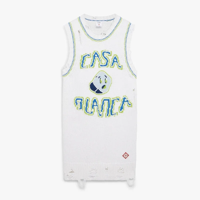 L’abito mini canotta bianco lavorato a mano presenta un design raffinato con elementi stilistici della nuova stagione, tra cui interpretazioni del logo Casablanca e la faccina sorridente sul davanti. Completato da dettagli effetto consumato, scollo rotondo, il logo a rombi iconico della Maison e una silhouette a canotta senza maniche.