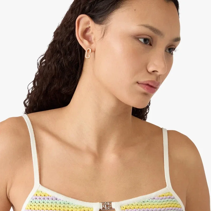 Il miniabito a righe Bourgeois è un raffinato modello in maglia, caratterizzato da eleganti dettagli a righe orizzontali. Completato da spalline sottili a contrasto, dal logo della Maison placcato argento sul petto e da un’apertura a goccia, con una silhouette lusinghiera che incarna l’approccio raffinato della Maison alla Maglieria.