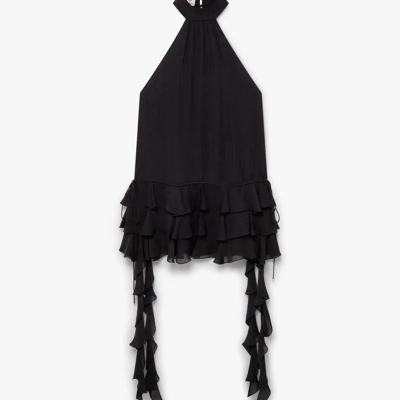 Il miniabito nero in georgette con doppio volant è un modello raffinato realizzato in lussuoso tessuto georgette doppio nero. Completato da scollo all’americana, logo della Maison in argento placcato sul petto, scollatura sulla schiena e eleganti volant che creano una silhouette femminile.