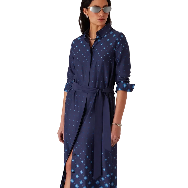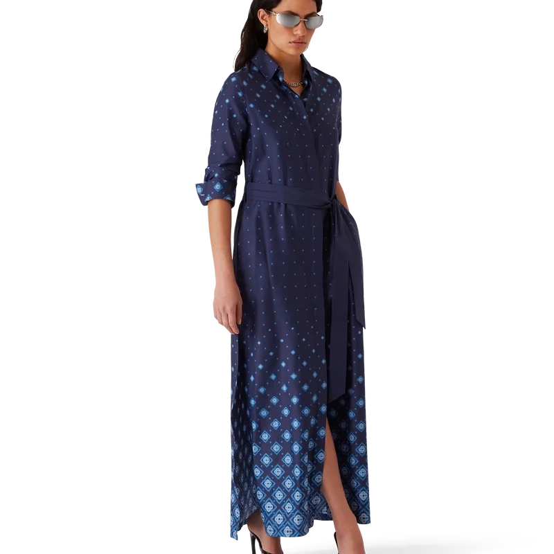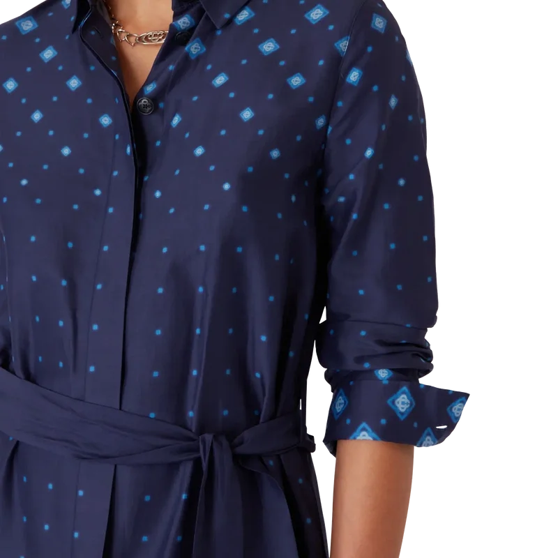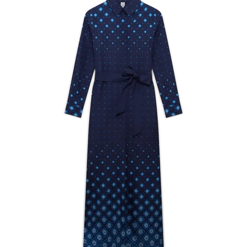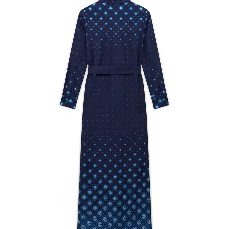 La camicia in seta sfumato è un modello classico a maniche lunghe e lungo fino ai piedi, caratterizzato dalla stampa sfumata Monogram, firma della Maison, in cui sfumature tono su tono scendono a cascata lungo la silhouette. Completato da colletto a punta, chiusura con bottoni, bottoni in corozo con logo CC intrecciato, passanti per cintura, cintura in tessuto tono su tono e bottoni smaltati con bordo dorato su colletto e polsini.