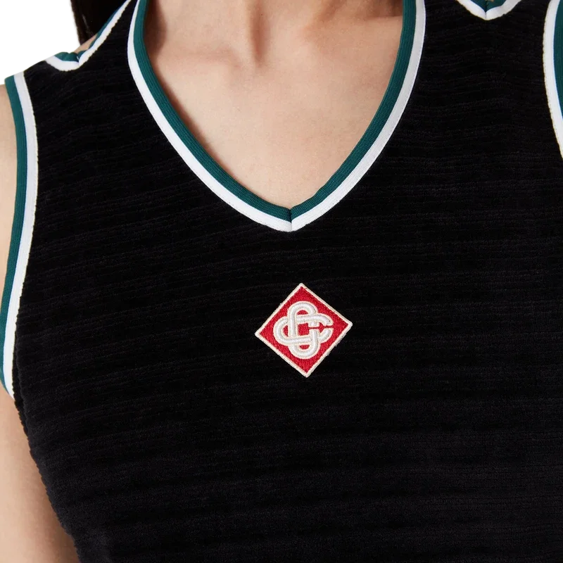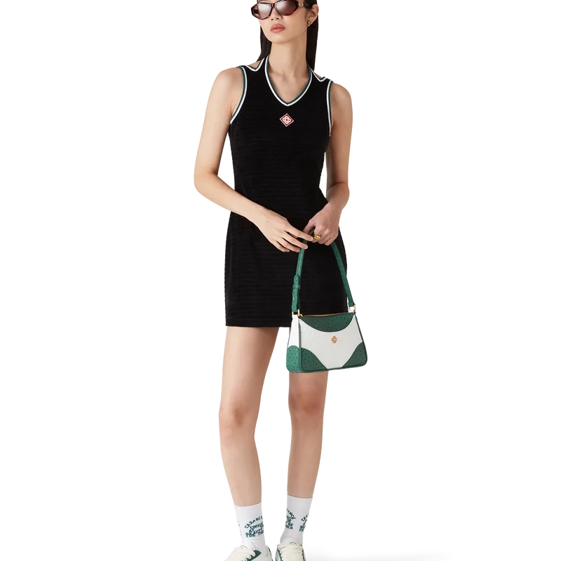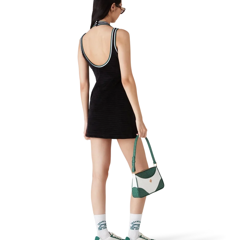 L’abito da tennis in velluto testurizzato è un modello mini dalla linea ad A realizzato in tessuto di velluto. Completato da scollo all’americana a V, spalline con profonda scollatura sulla schiena e il logo a diamante iconico della Maison sul petto.