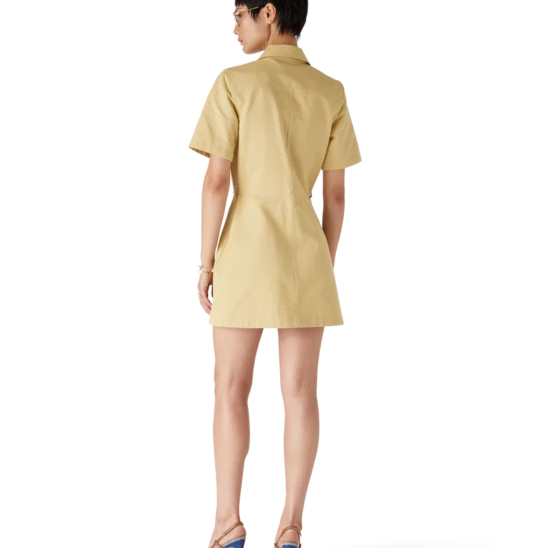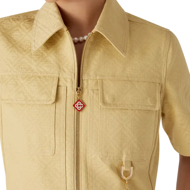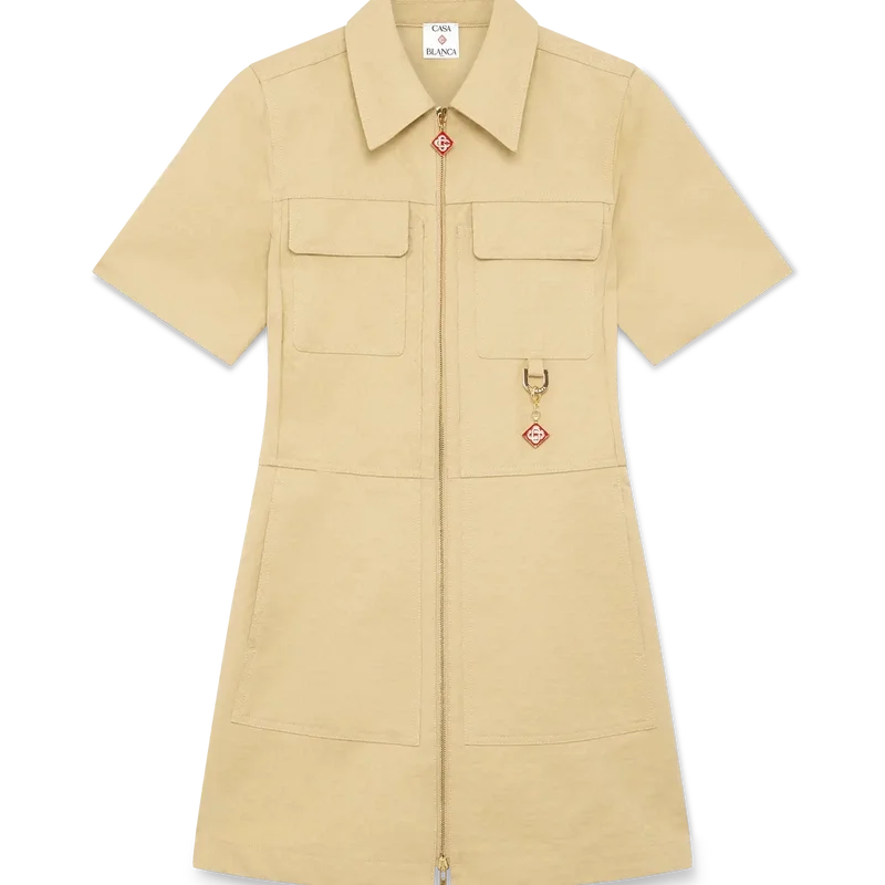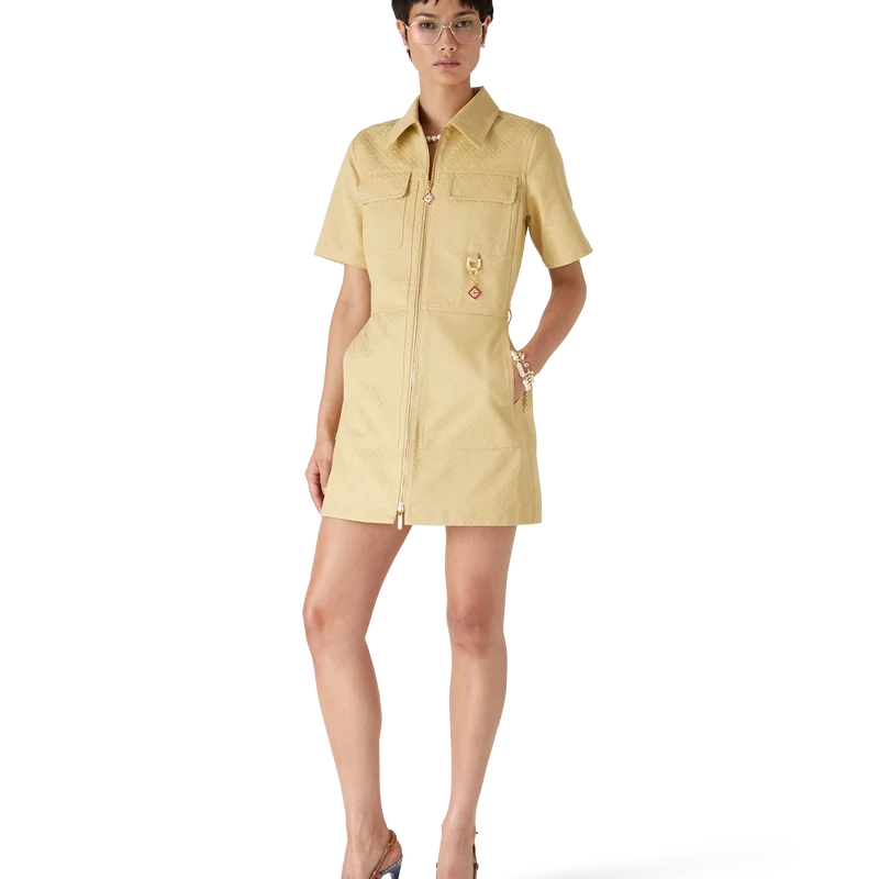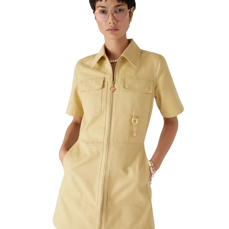 L’abito in jacquard di cotone Monogram è un miniabito a maniche corte e dalla linea ad A, realizzato in tessuto jacquard di cotone Monogram. È rifinito con colletto a punta, chiusura frontale con cerniera dotata del caratteristico tiretto con logo a diamante della Maison, tasche applicate e tasche con patta.
