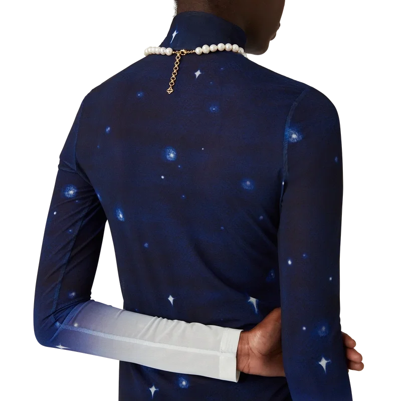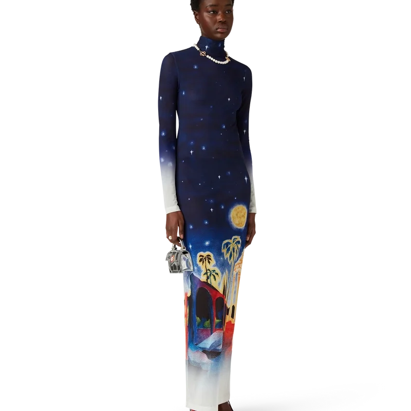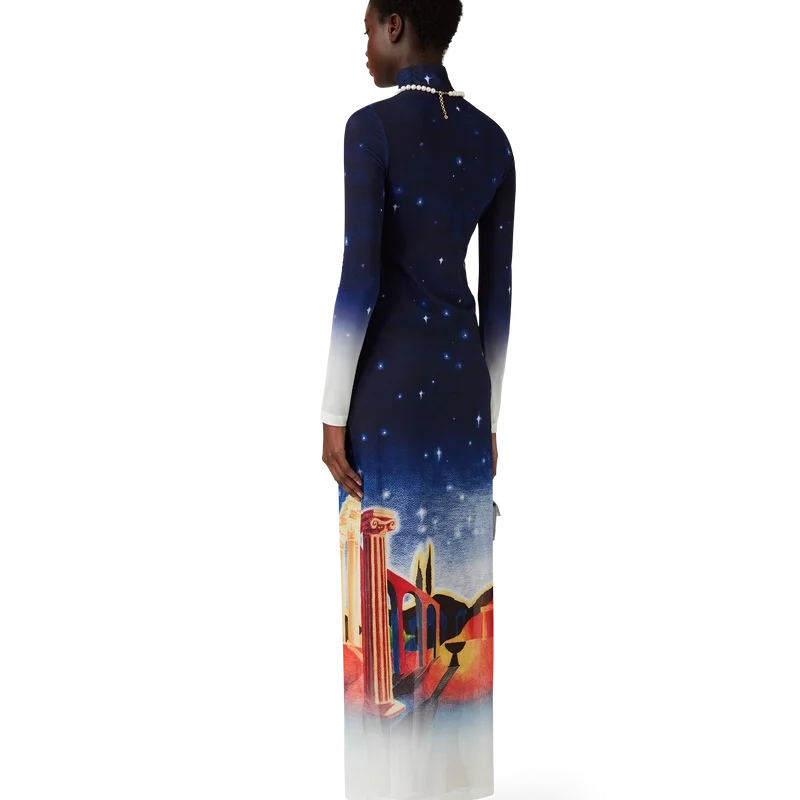 Il vestito in rete Midnight Acropolis è un modello a maniche lunghe con stampa all-over, realizzato in tessuto a rete elasticizzato con la stampa stagionale della Maison, che rende omaggio alla splendida notte dell’antica Grecia con la luce del tempio e del cielo, completato da un classico collo a polo.