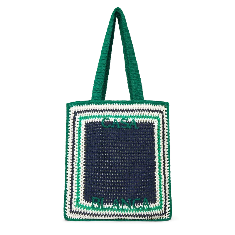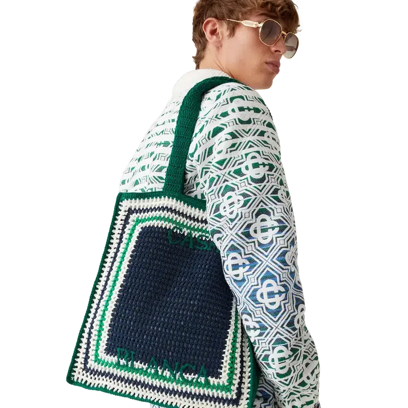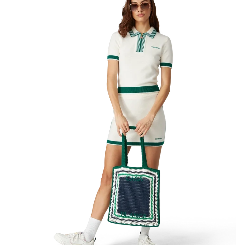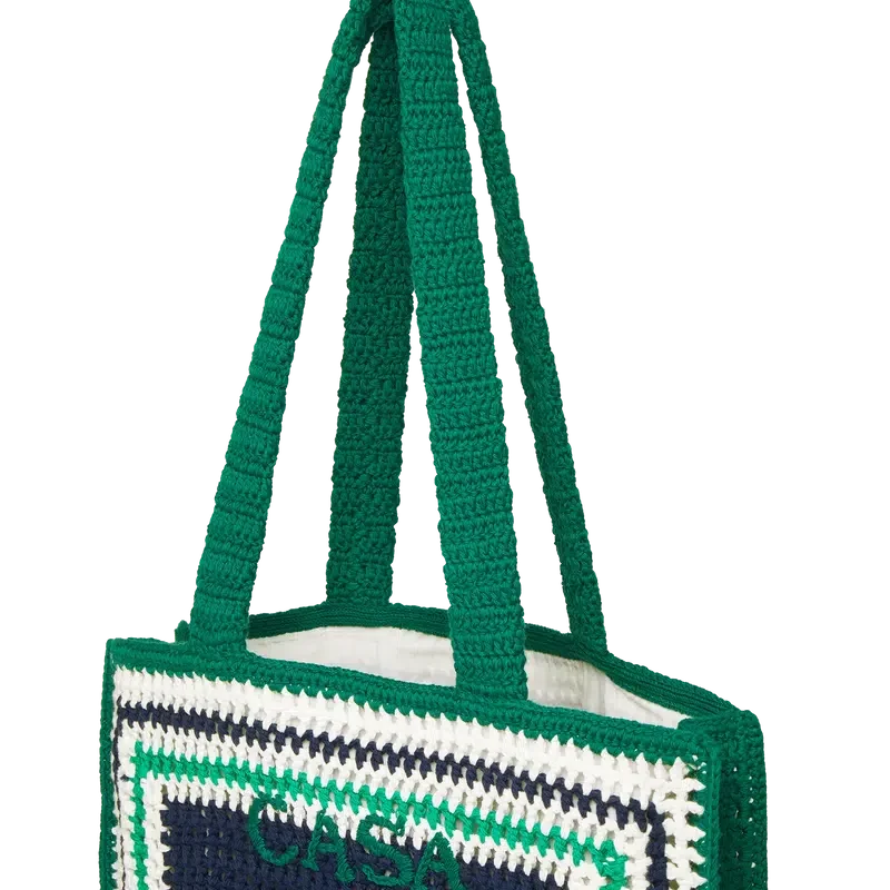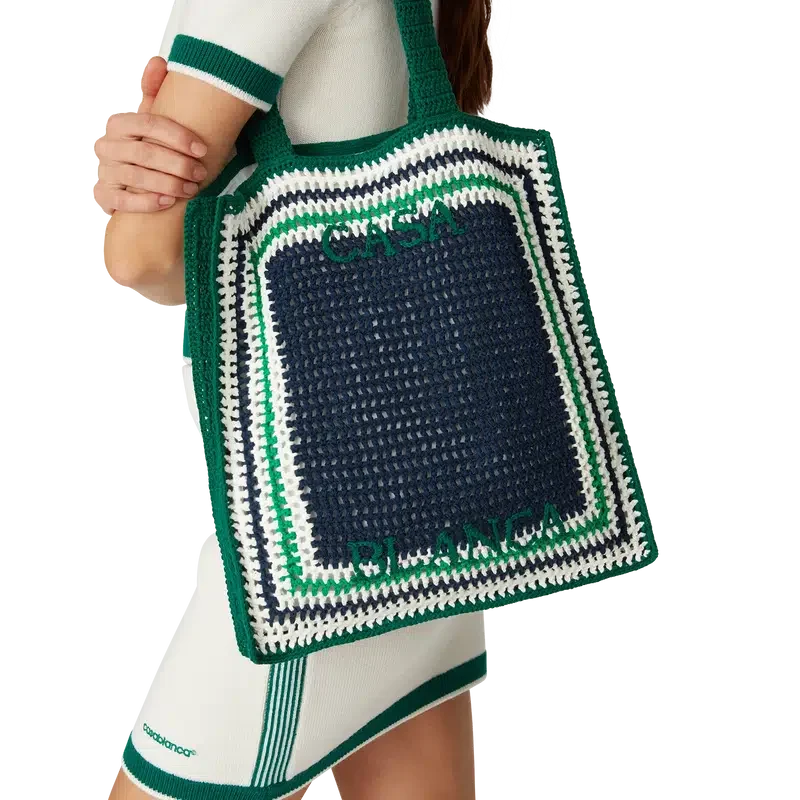 La borsa Stripe Crochet è un modello lavorato a maglia in tessuto di cotone all’uncinetto e presenta una silhouette morbida. Rifinita con un logo nero ricamato e manici che consentono di indossarla a tracolla o a mano.
