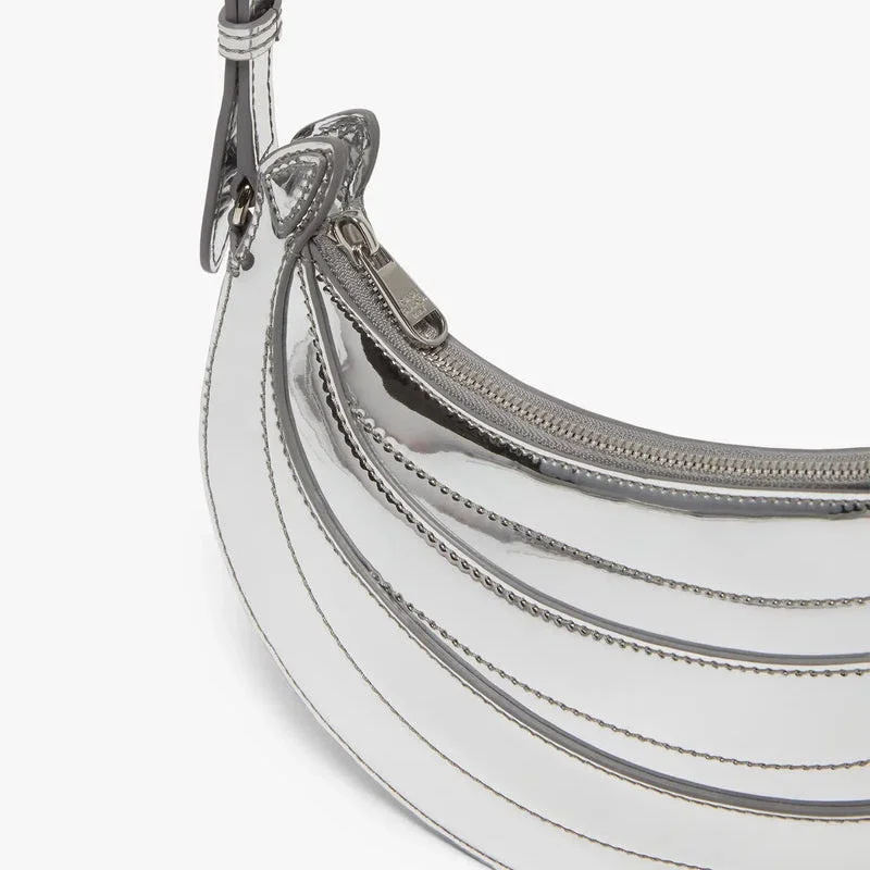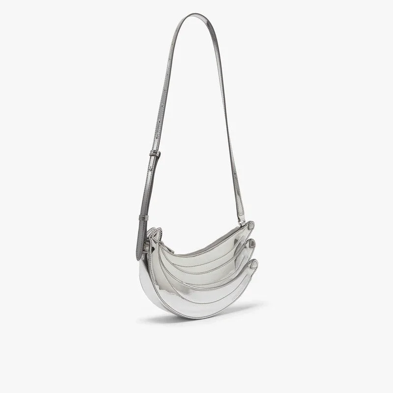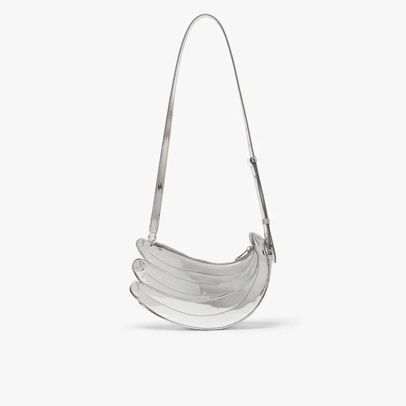 La borsa a banana argento è realizzata in pelle con finitura argento altamente lucidata, caratterizzata da una silhouette scultorea e curva a forma di banana. Completa di tracolla in pelle regolabile, tracolla a catena in metallo argento, chiusura con cerniera, dettagli in metallo placcato argento e logo Casablanca. Fornita con cofanetto regalo, sacchetto antipolvere con marchio e libretto con i dettagli del prodotto.