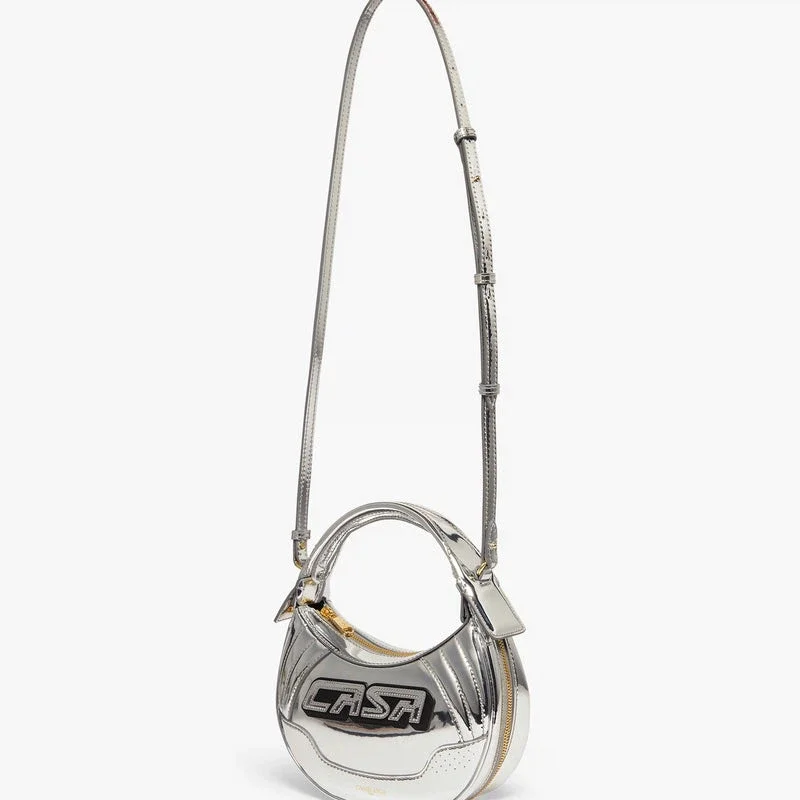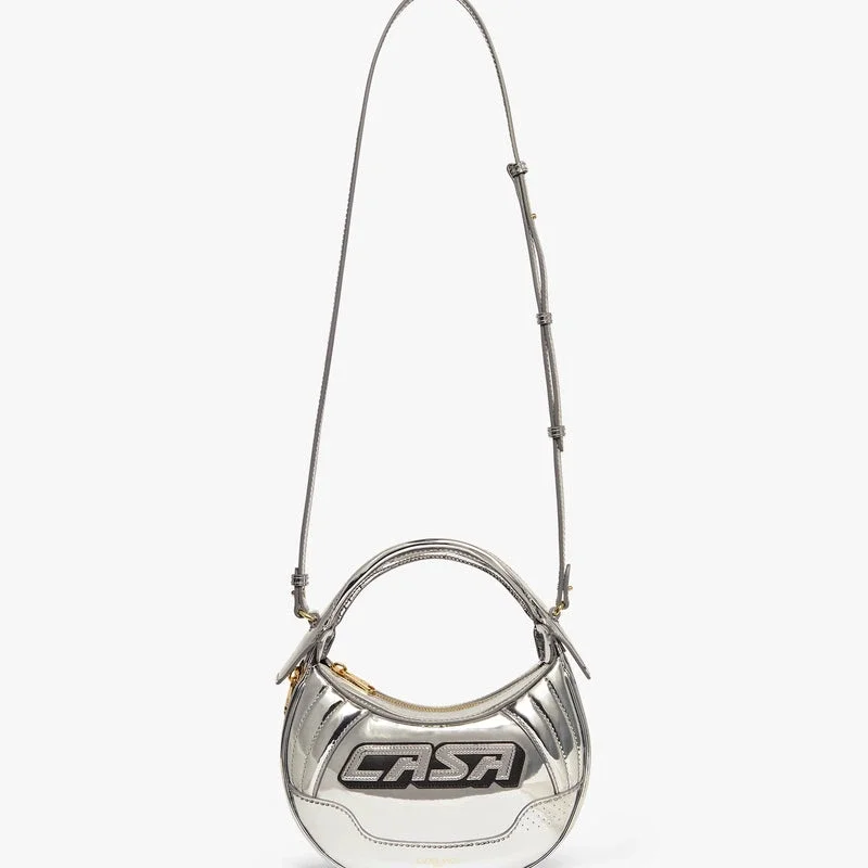La borsa da motociclista argento è realizzata in pelle e presenta l’iscrizione “Casa” sul davanti. È dotata di tracolla, chiusura con cerniera, dettagli con cerniera, finiture placcate in oro e una silhouette arrotondata. Fornita con cofanetto regalo, sacchetto antipolvere con marchio e libretto con i dettagli del prodotto.