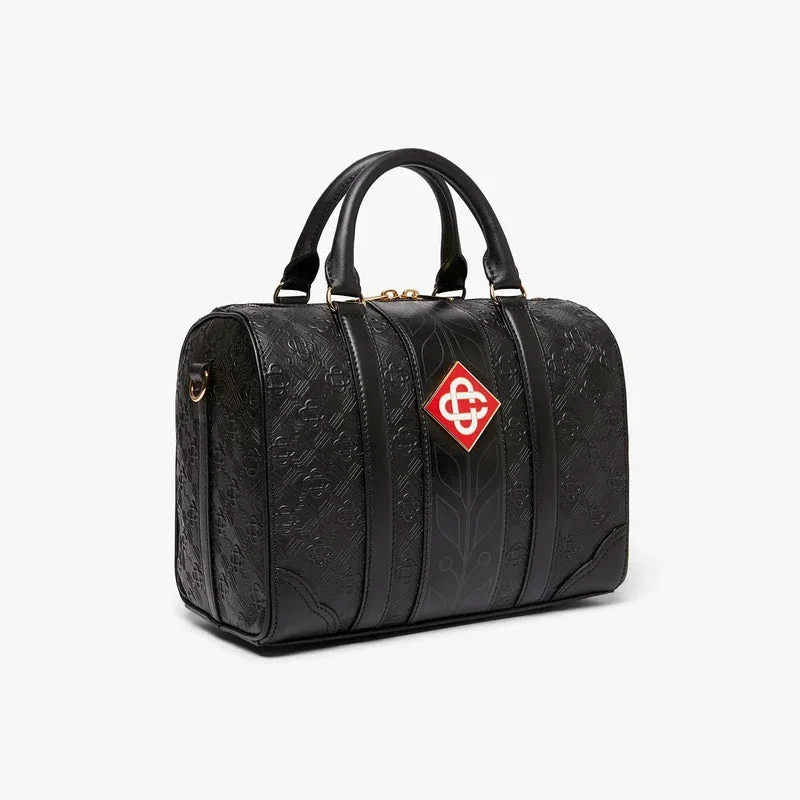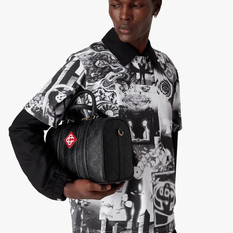 La borsa da weekend Mini Monogram nera è realizzata in pelle italiana, impreziosita dal caratteristico logo a rombi della Maison sul lato. Completata dal caratteristico motivo a alloro della Maison, manici, chiusura con cerniera, tracolla, tasca interna e finiture in ottone. Fornita con una confezione regalo firmata Casablanca, una custodia antipolvere e un libretto con i dettagli del prodotto.