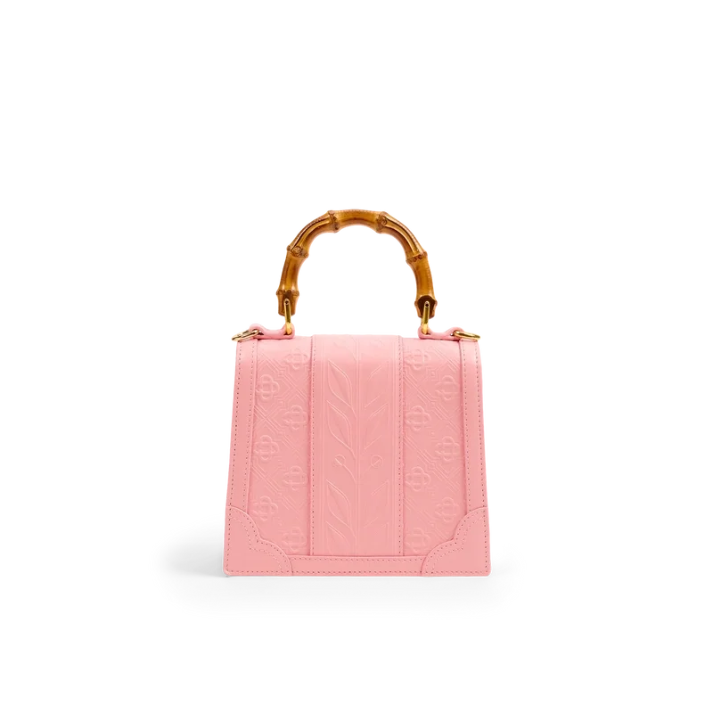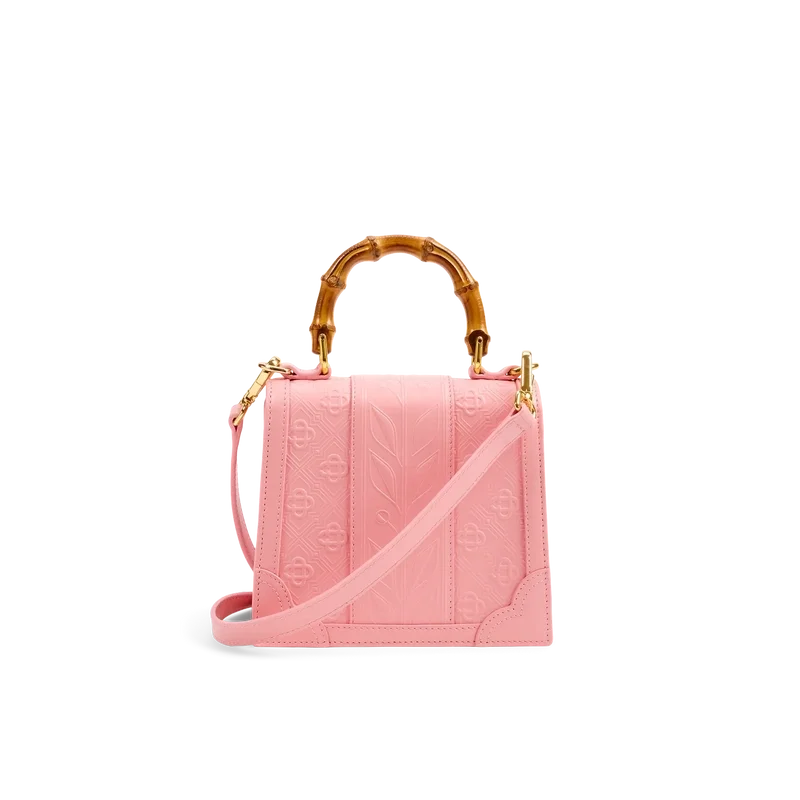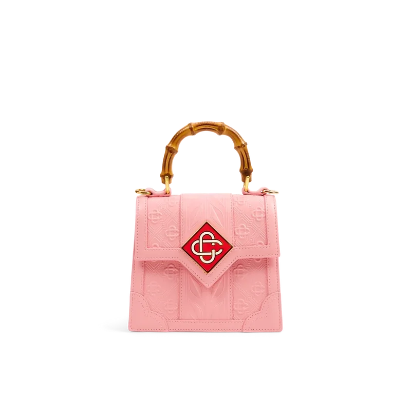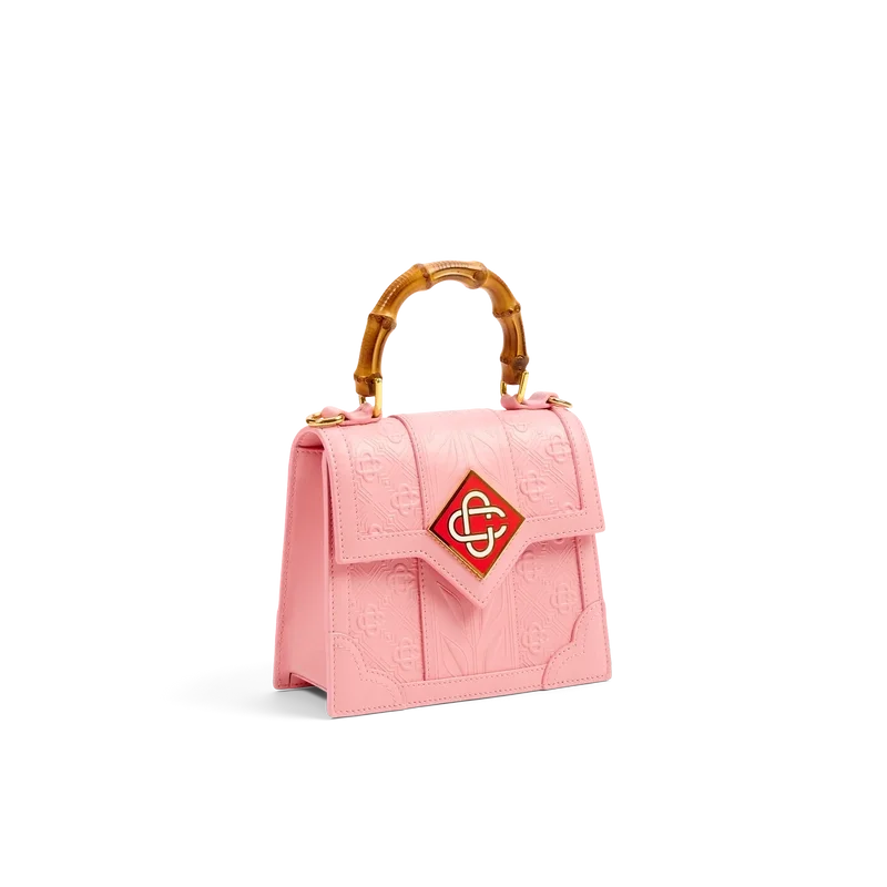 La borsa Mini Jeanne rosa è il modello iconico della Maison con manici in bambù e apertura con patta, reinterpretato per questa stagione. Realizzata in pelle di vitello italiana al 100%, la borsa rosa è impreziosita dal Diamond Monogram in rosso a contrasto e da una tracolla coordinata.