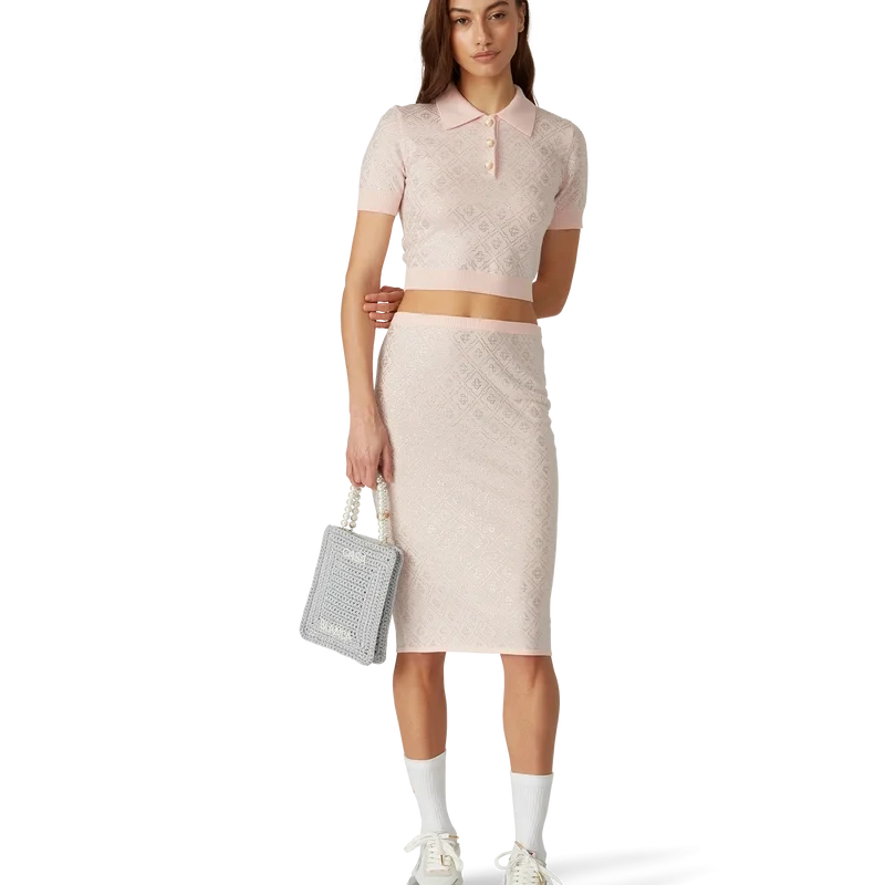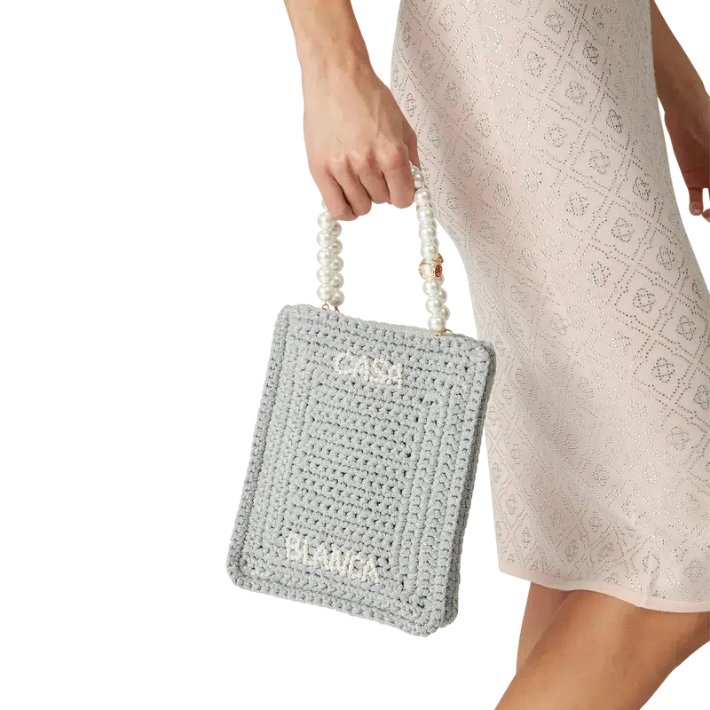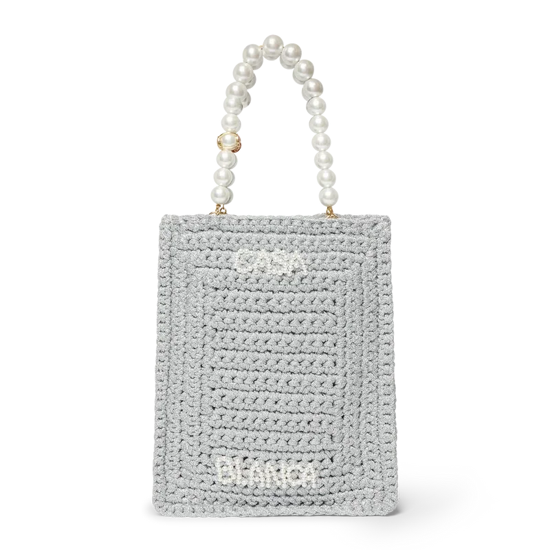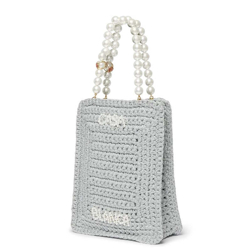 La borsa Pearl Mini Crochet è realizzata in tessuto metallico lavorato all’uncinetto con perline. Rifinita con doppio manico e logo Casablanca in rilievo.