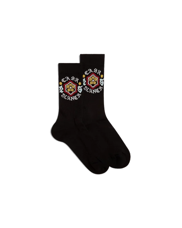 I calzini Emblem sono un modello sportivo realizzato in tessuto misto cotone e caratterizzati da una grafica stagionale con il logo Casablanca: abbiamo tratto ispirazione dalla sottocultura giapponese per uno dei nostri temi principali. Rifiniti con gambale e polsini a costine.