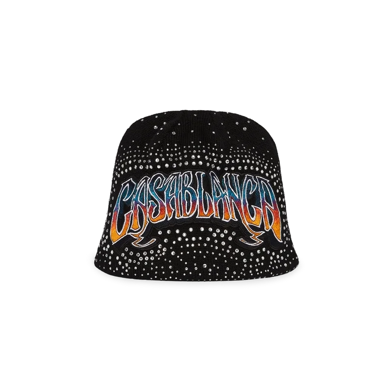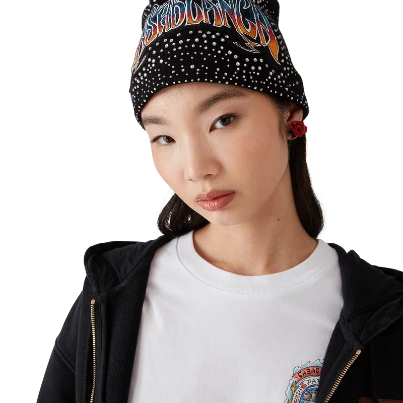 Il berretto decorato con cristalli gotici è un modello intrecciato realizzato in tessuto di lana con dettagli in cristalli. Completato da una tipografia ricamata a mano del logo Casablanca, ispirata al carattere gotico utilizzato nei tatuaggi.
