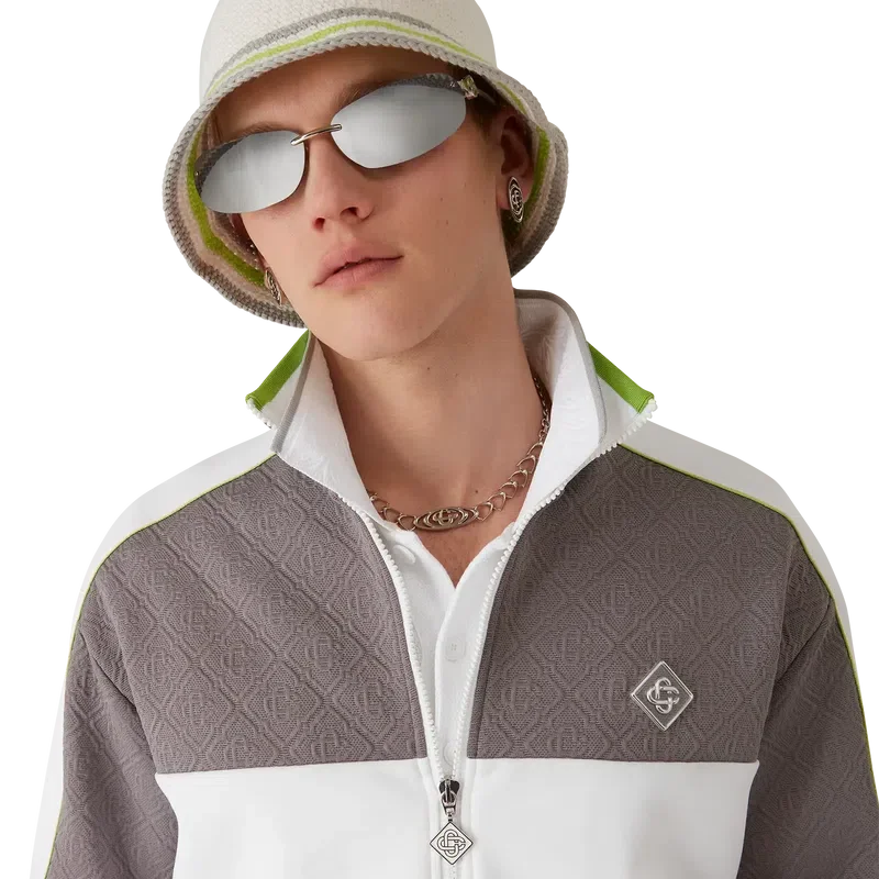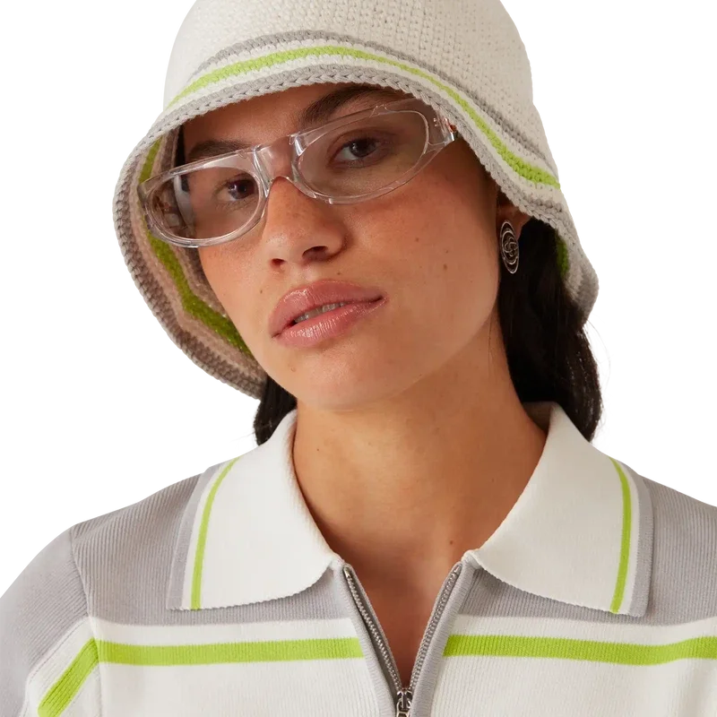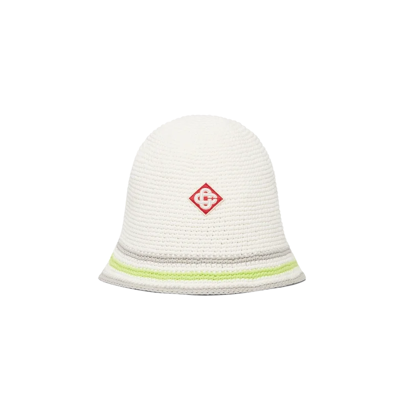 Il cappello all’uncinetto a righe presenta una classica silhouette a secchiello, realizzato in morbido tessuto di cotone all’uncinetto a trama aperta: il capo essenziale per l’estate. Rifinito con una visiera a righe verde, grigia e bianca e un’applicazione con il logo Casablanca Glass al centro.