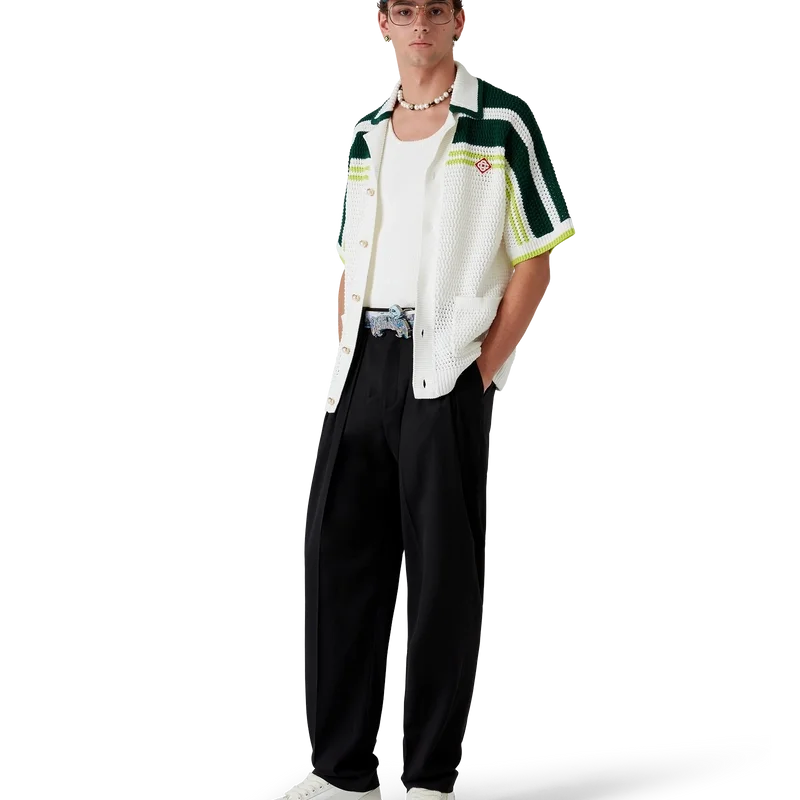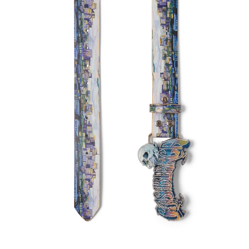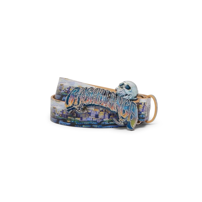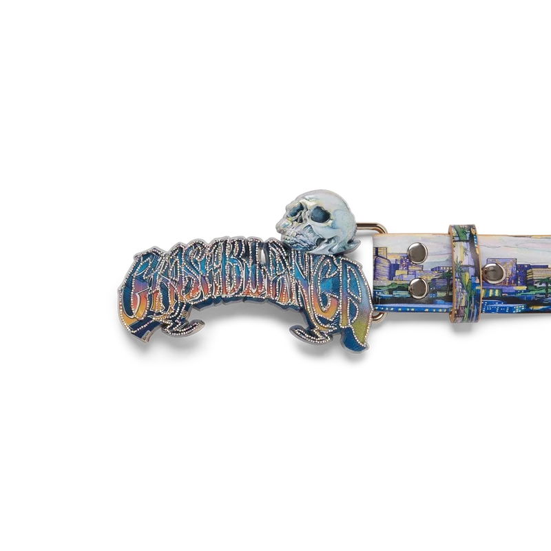 La cintura La Premonition presenta un design che riprende l’artwork stagionale della Maison, ispirato a una visione inquietante dello skyline di Los Angeles di notte, con elementi UFO che richiamano l’ispirazione fantascientifica vintage, realizzata in pelle di vitello. Completata da una fibbia in ottone verniciato con il logo Casablanca in tipografia disegnata a mano, ispirata al carattere gotico usato nei tatuaggi, nei colori sfumati della stagione e un teschio.
