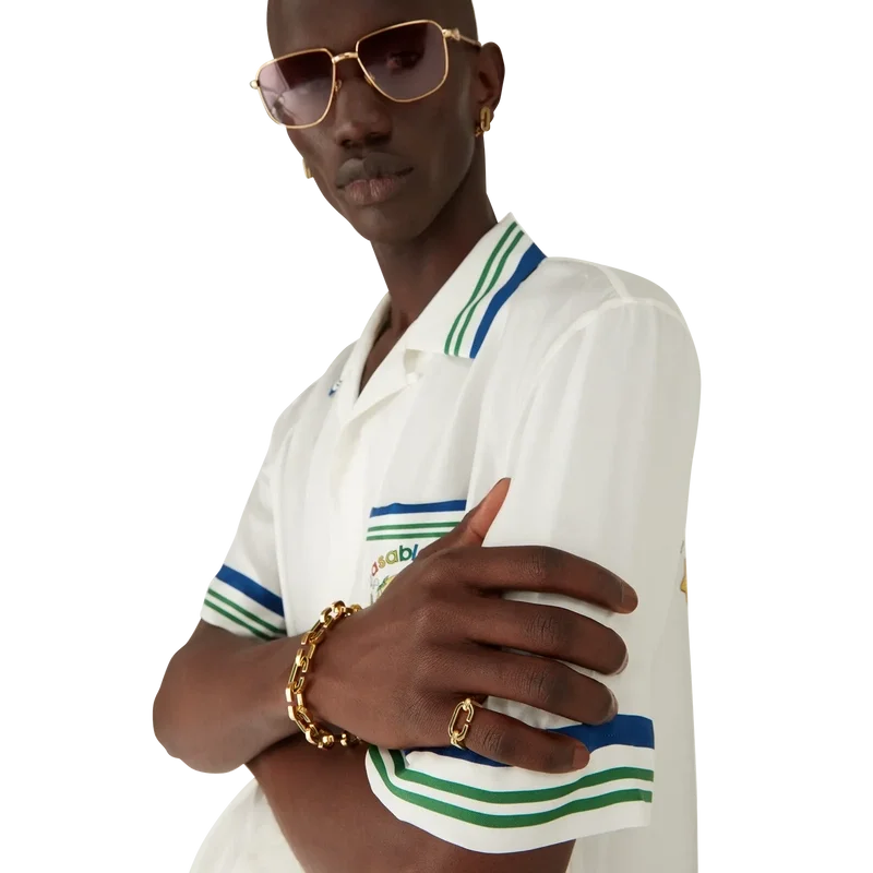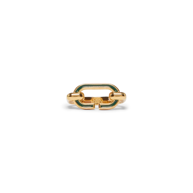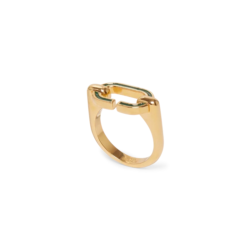 L’anello a maglia ‘C’ è un modello minimalista realizzato in ottone placcato oro e smalto. Completato da una “C” in smalto verde dipinta a mano e da una fascia placcata in oro.