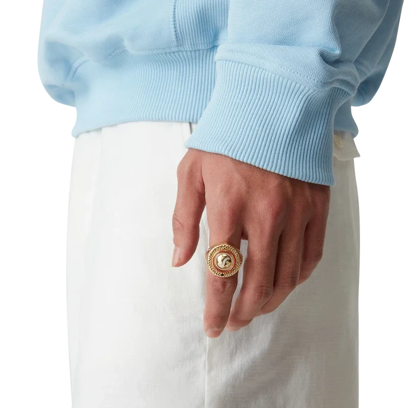 L’anello medaglione sportivo è realizzato in ottone placcato oro e smalto dipinto a mano. Completato dal logo a forma di diamante, simbolo della Maison, sul gambo.
