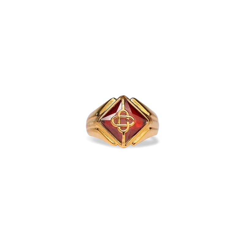 L’anello con sigillo Casa è realizzato in ottone placcato oro e cristalli. Completo del logo a forma di diamante con le lettere Cc intrecciate della Maison e di dettagli dipinti sul gambo, questo gioiello viene fornito con una confezione regalo, una custodia antipolvere e un libretto con i dettagli del prodotto.