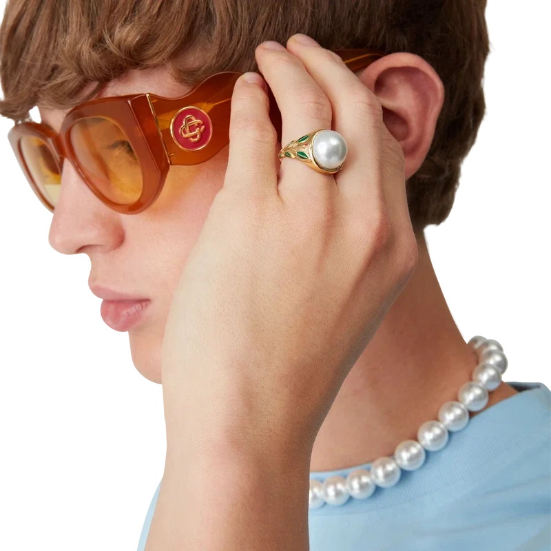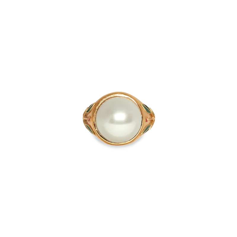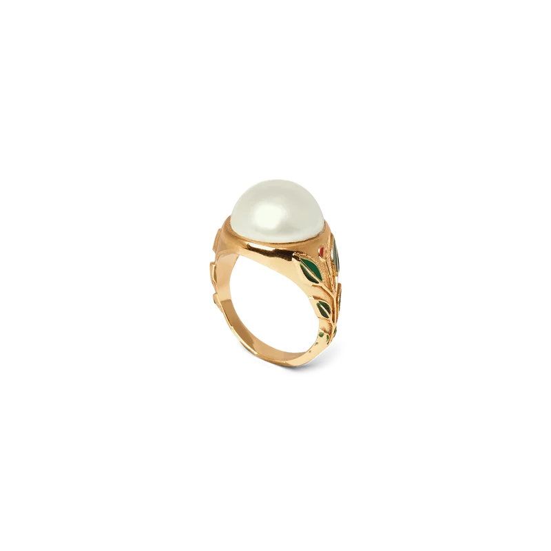 L’anello con sigillo e perla è realizzato in ottone placcato oro, smalto e cabochon di perla di vetro. Completo di dettagli floreali dipinti a mano sul gambo, questo articolo viene fornito con una confezione regalo, una custodia con marchio e un libretto con i dettagli del prodotto.