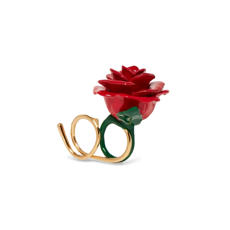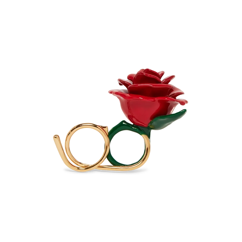 Il doppio anello Rose si ispira ai tatuaggi delle sottoculture di La. Realizzato in smalto dipinto a mano e ottone placcato oro. La rosa si trasforma in una maglia e si intreccia attorno alle dita per formare un doppio anello.