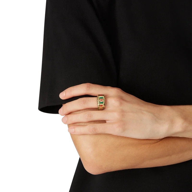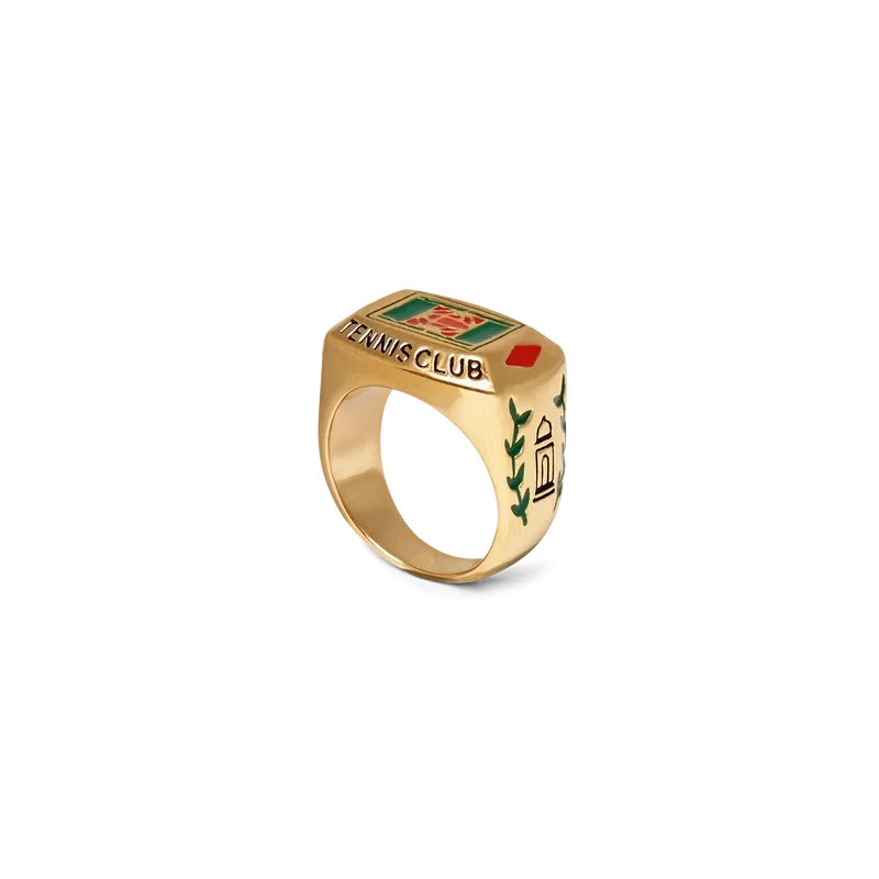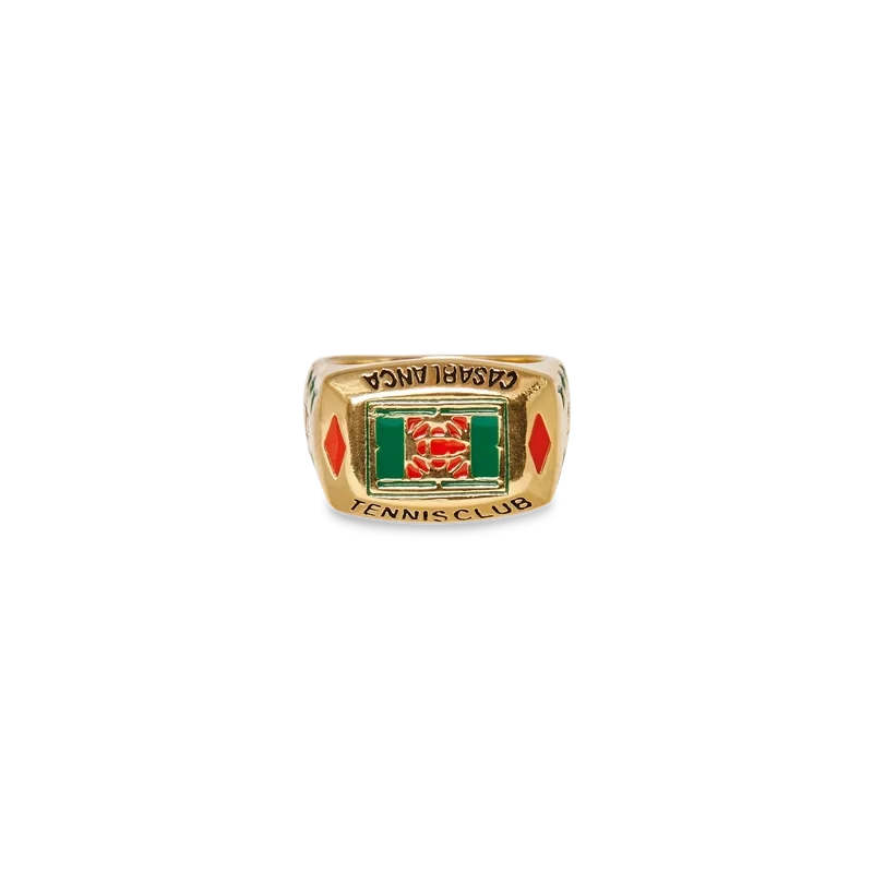 L’anello Tennis Club è un gioiello della nostra collezione principale ispirato all’identità della Maison, realizzato in ottone placcato oro e smalto dipinto a mano. Rifinito con dettagli di fogliame e il marchio Casablanca Tennis Club, questo gioiello viene fornito con una confezione regalo, un sacchetto antipolvere con marchio e un libretto con i dettagli del prodotto.