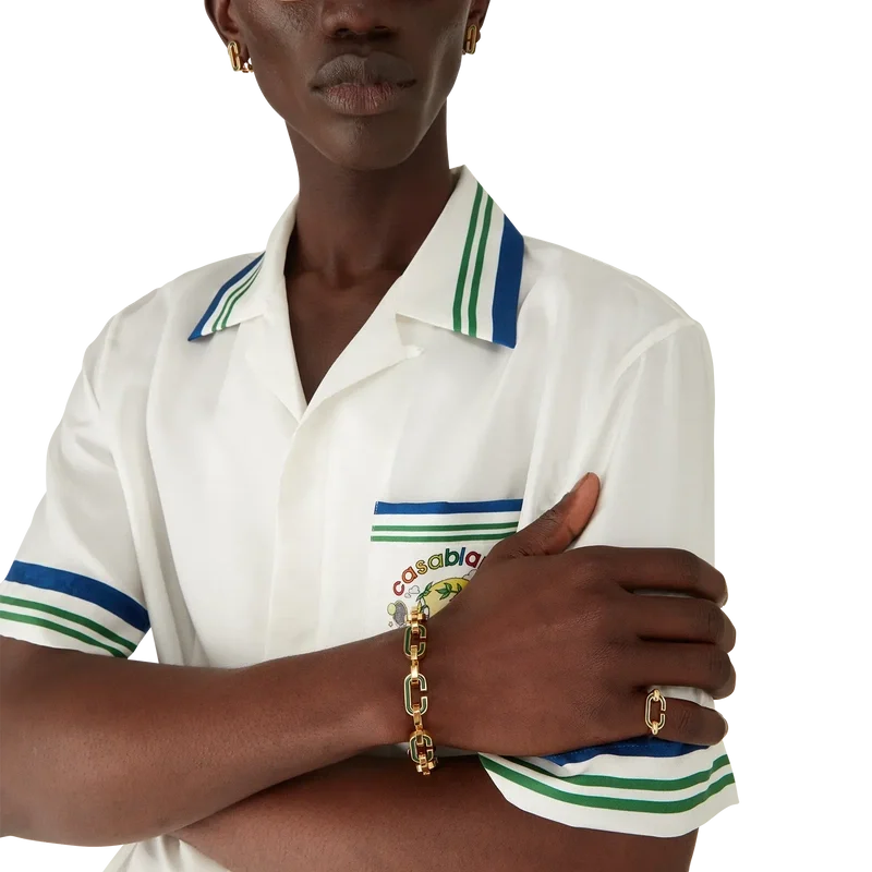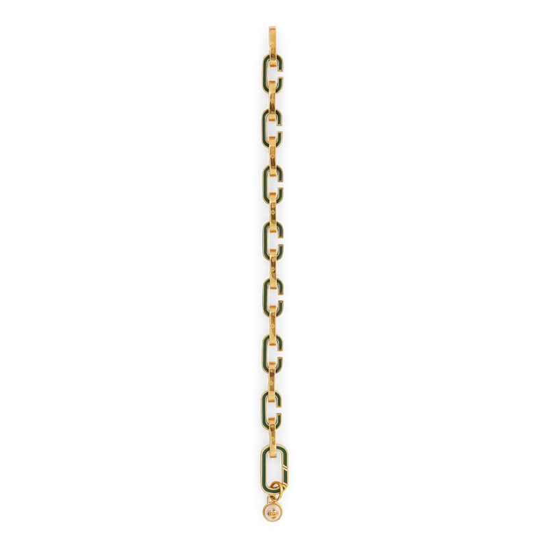 Il bracciale a maglie “C” è realizzato in ottone placcato oro e smalto. Rifinito con una catena placcata oro a maglie “C” con smalto verde dipinto a mano. Ottone e smalto