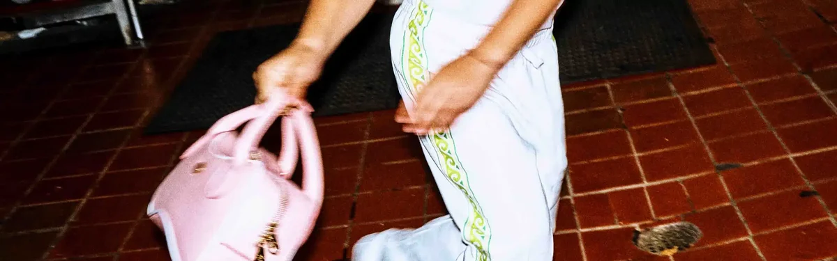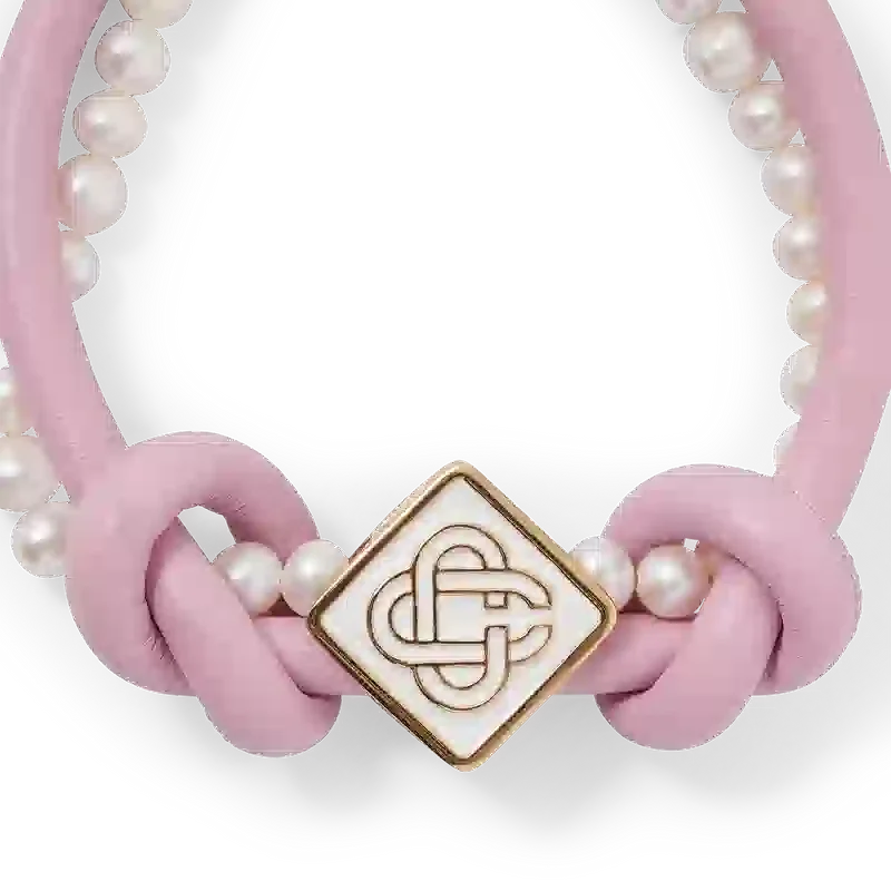 Il bracciale con perle annodate rosa è realizzato in pelle e perle d’acqua dolce e presenta il logo a diamante iconico della Maison. Rifinito con chiusura a moschettone e catena placcate in oro.