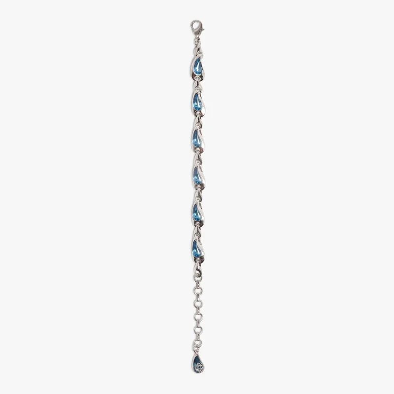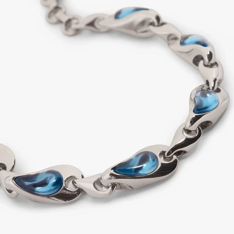 Il bracciale con goccia d’acqua argento e blu è un elegante modello realizzato in ottone e resina, caratterizzato da un delicato motivo a goccia d’acqua nei toni dell’argento e del blu. Completato da una raffinata struttura a maglie placcata argento per un tocco finale di classe.