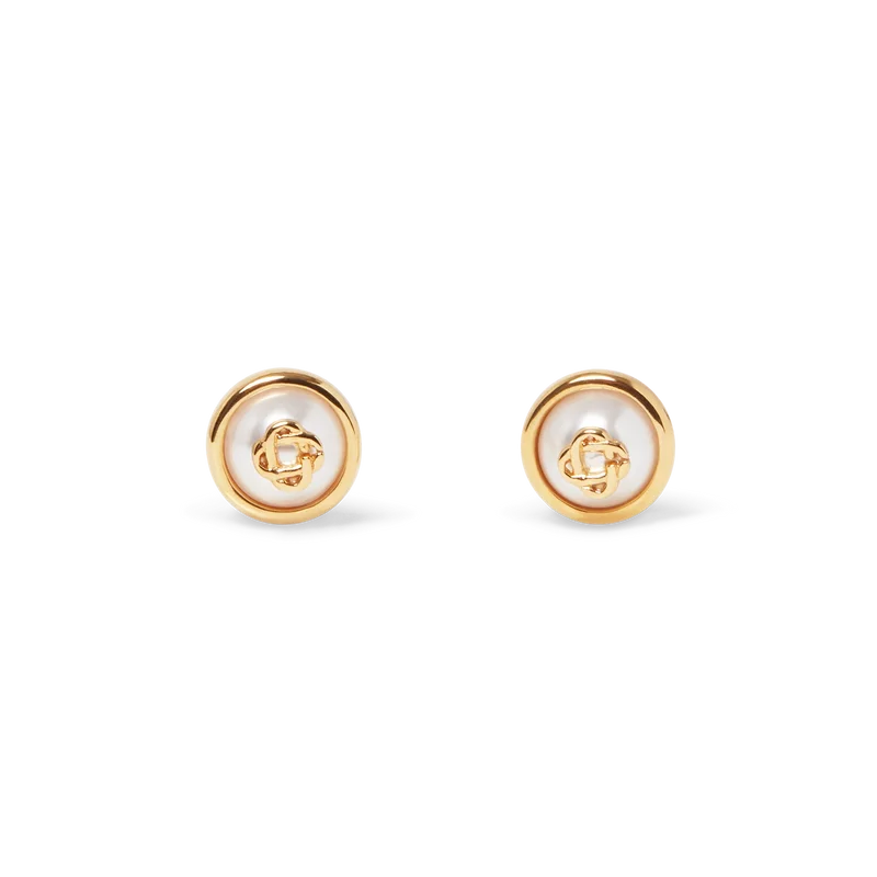 Gli orecchini a bottone con logo a perla sono un paio di orecchini a forma di cupola, realizzati in perla di vetro e ottone placcato oro. Completati dal logo CC intrecciato della Maison posizionato sulla sommità della cupola.