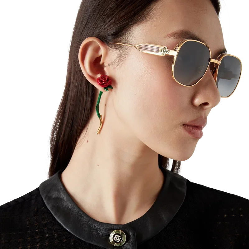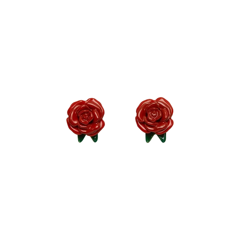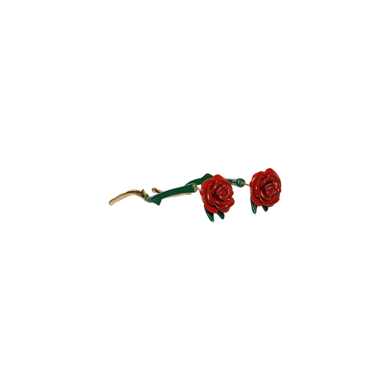Gli orecchini Rose Drop sono un paio di orecchini a forma di rosa con il gambo che attraversa il lobo. Realizzati in smalto dipinto a mano e ottone placcato oro. Questo articolo è progettato esclusivamente per orecchie forate.