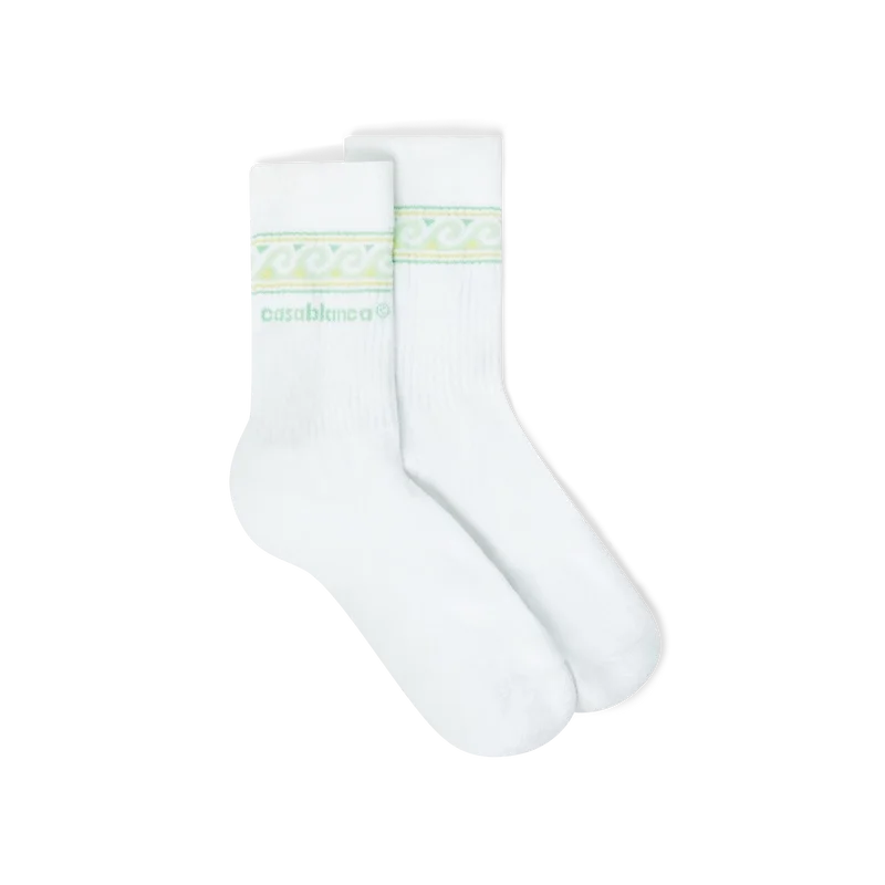 I calzini sportivi a maglia con motivo a onde presentano un design atletico raffinato caratterizzato da un bordo ondulato nei colori verde e giallo, che trae ispirazione dai motivi ritmici delle onde dell’oceano che incontrano le rive incontaminate della spiaggia. Questo design incarna l’estetica da beach club della Maison attraverso sofisticati motivi a onde realizzati su una struttura a maglia di alta qualità. Completati da polsini a costine e struttura rinforzata su tallone e punta.