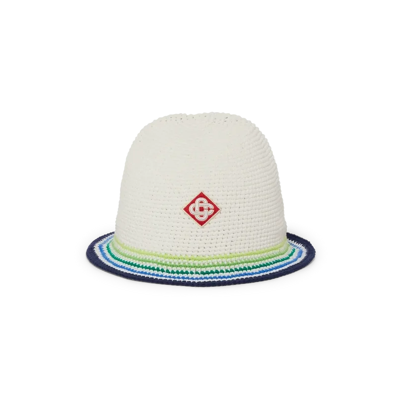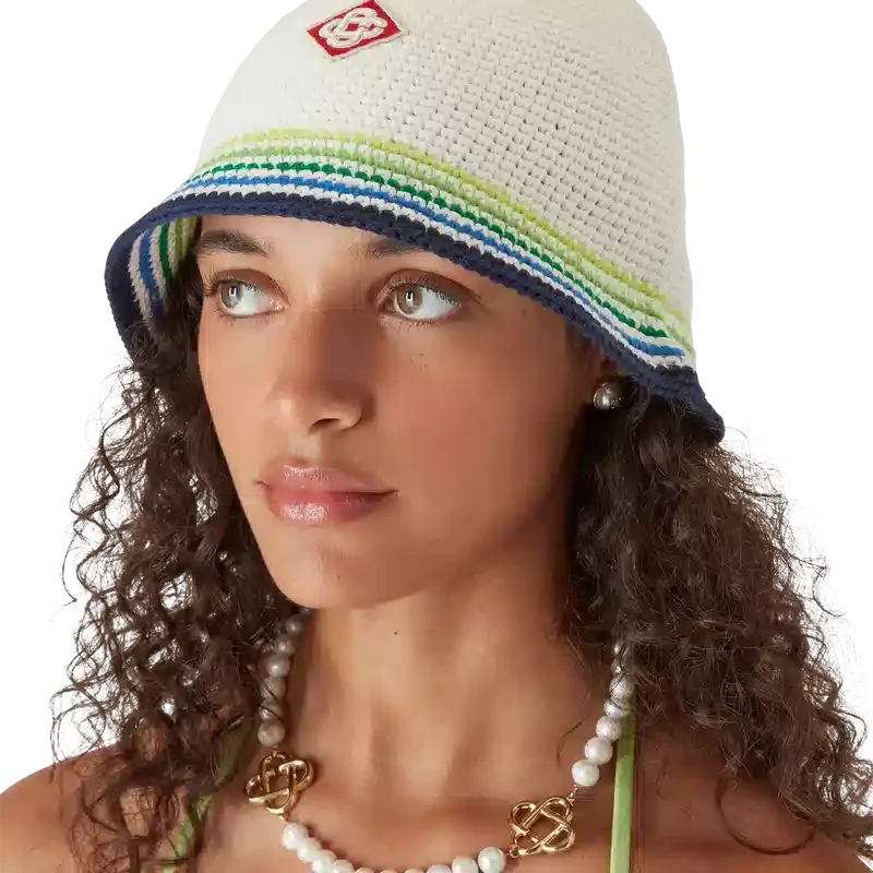 Il cappellino Beach Club è un raffinato modello a secchiello realizzato in cotone all’uncinetto con il logo a rombi iconico della Maison al centro. Rifinito con una visiera a righe blu, verde, gialle e bianche.