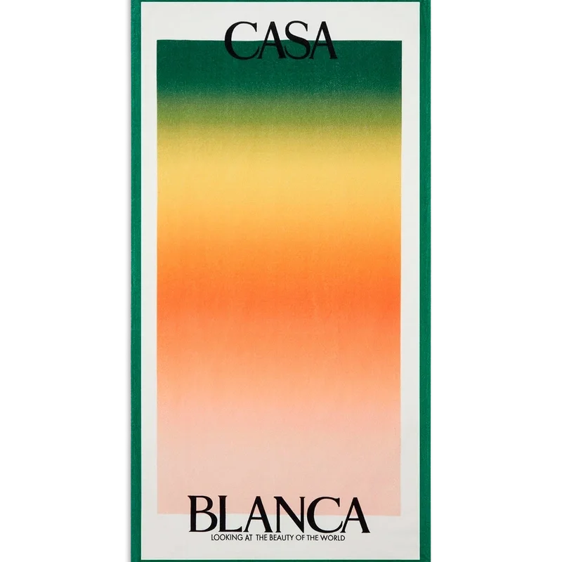 L’asciugamano da spiaggia Gradient è realizzato in cotone biologico e presenta il logo sovrapposto della Maison su uno sfondo con stampa sfumata di stagione, rappresentativa dei ricchi scambi tra le discipline culturali nell’arte, nella musica e nel cinema africani. Rifinito con una cornice bianca e bordi verdi.