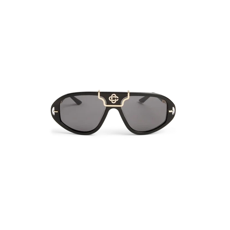 La struttura in acetato nero e oro degli occhiali da sole Hacienda caratterizza questi occhiali dalla montatura rettangolare. Il logo Diamond Monogram di Casablanca è posizionato sul ponte. Le lenti grigie offrono una protezione UV al 100% e il modello è completato da una confezione Casablanca, un panno per la pulizia e un libretto di garanzia.