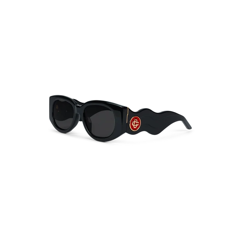 La struttura in acetato nero dal design audace degli occhiali da sole Memphis caratterizza questa montatura rettangolare. Il caratteristico logo Casablanca con Diamond Monogram è posizionato sulle aste. Le lenti grigie sfumate offrono una protezione UV al 100% e il set è completato da una confezione Casablanca, un panno per la pulizia e un libretto di garanzia.