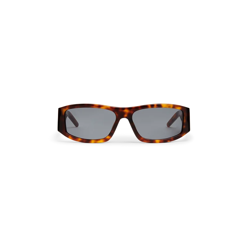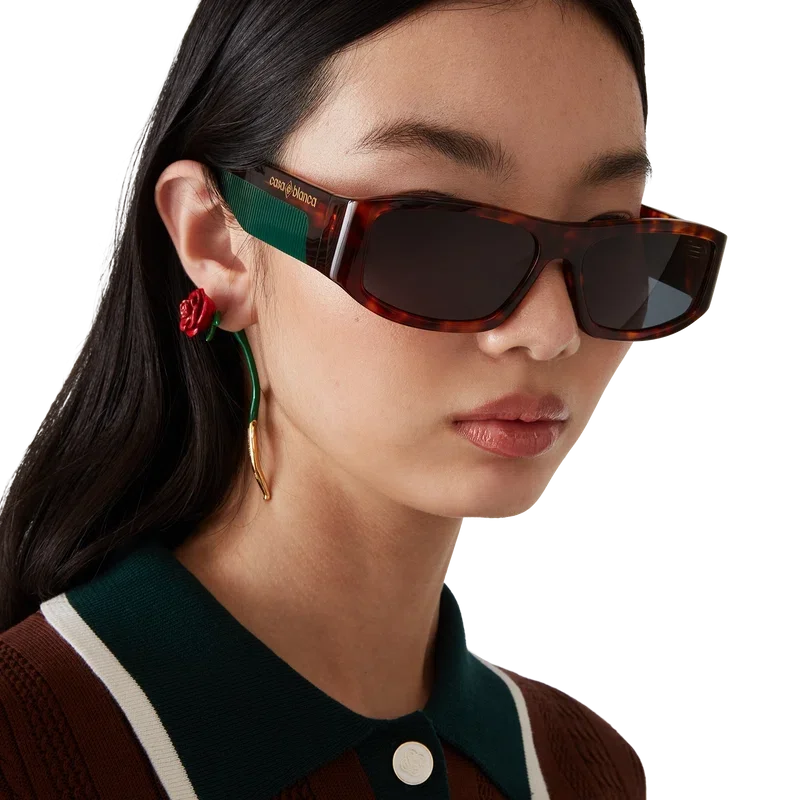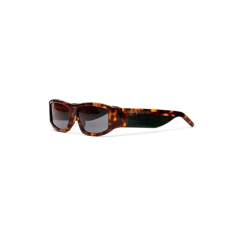 Gli occhiali da sole rettangolari tartarugati sono realizzati con una struttura in acetato caratterizzata dal logo Casablanca posizionato sulle aste e da un dettaglio verde effetto pettine. Le lenti grigie offrono protezione dai raggi UV e il modello è completo di confezione regalo, panno per la pulizia e libretto con garanzia e dettagli sul prodotto.