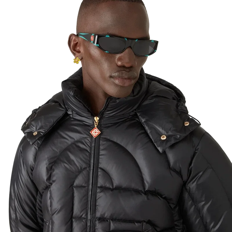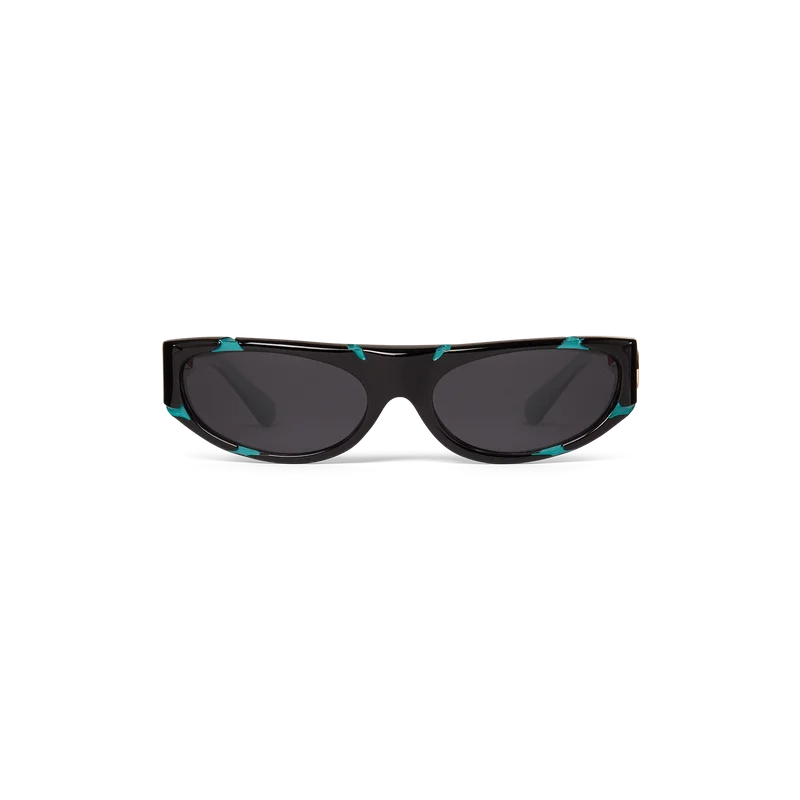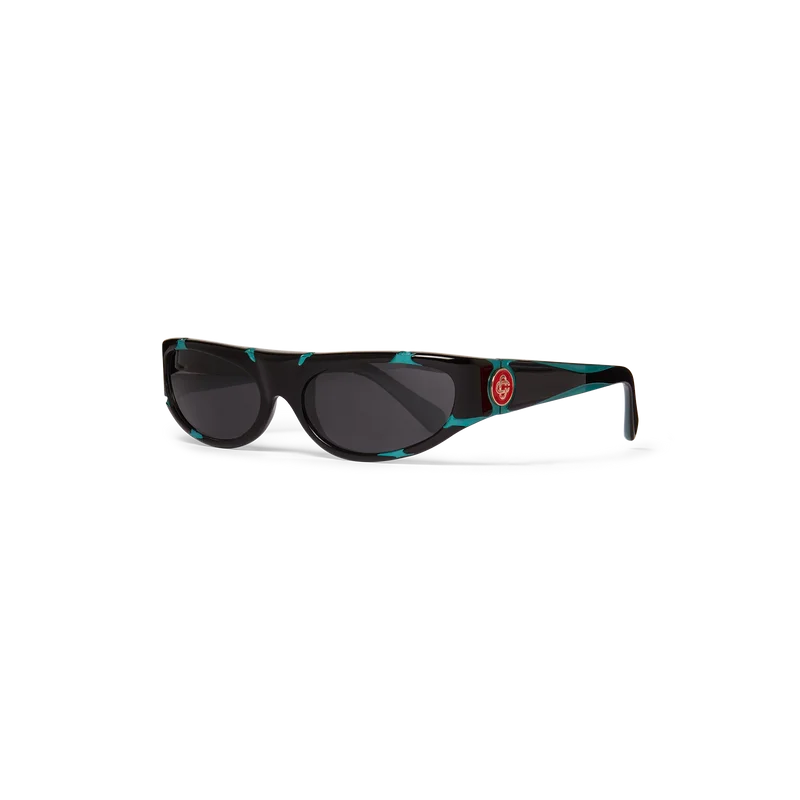 Gli occhiali da sole sportivi nero e menta presentano una montatura rettangolare in acetato con il logo CC intrecciato della Maison sulle aste. Le lenti di colore nero offrono protezione e il modello è completato da una custodia Casablanca, un panno per la pulizia e un libretto di garanzia.