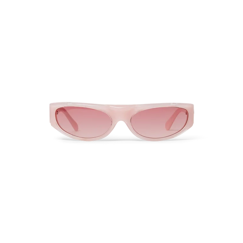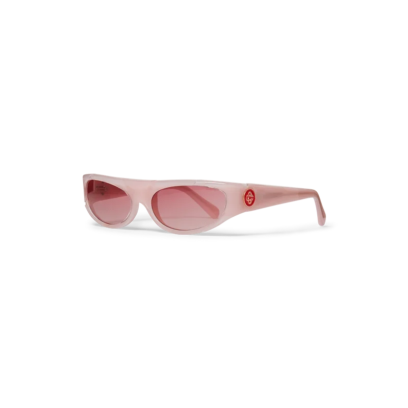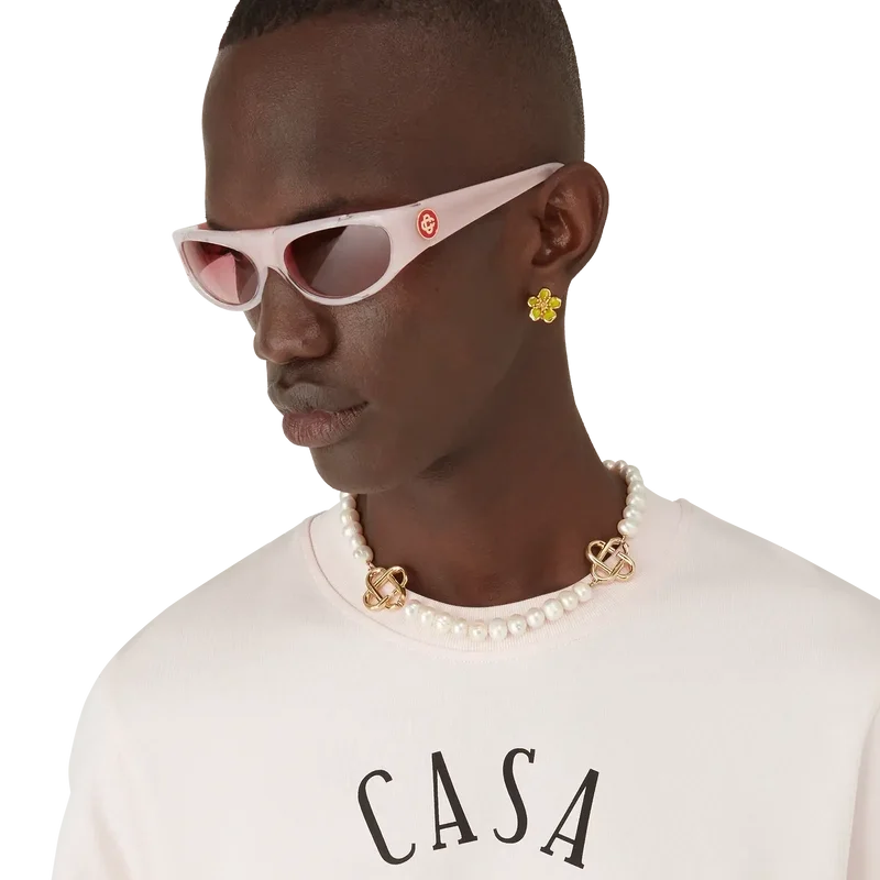 Gli occhiali da sole sportivi rosa presentano una montatura di forma rettangolare realizzata in acetato. Il modello presenta il logo CC intrecciato della Maison sulle aste. Le lenti di colore rosa sono protettive e il modello è completo di custodia Casablanca, panno per la pulizia e libretto di garanzia.