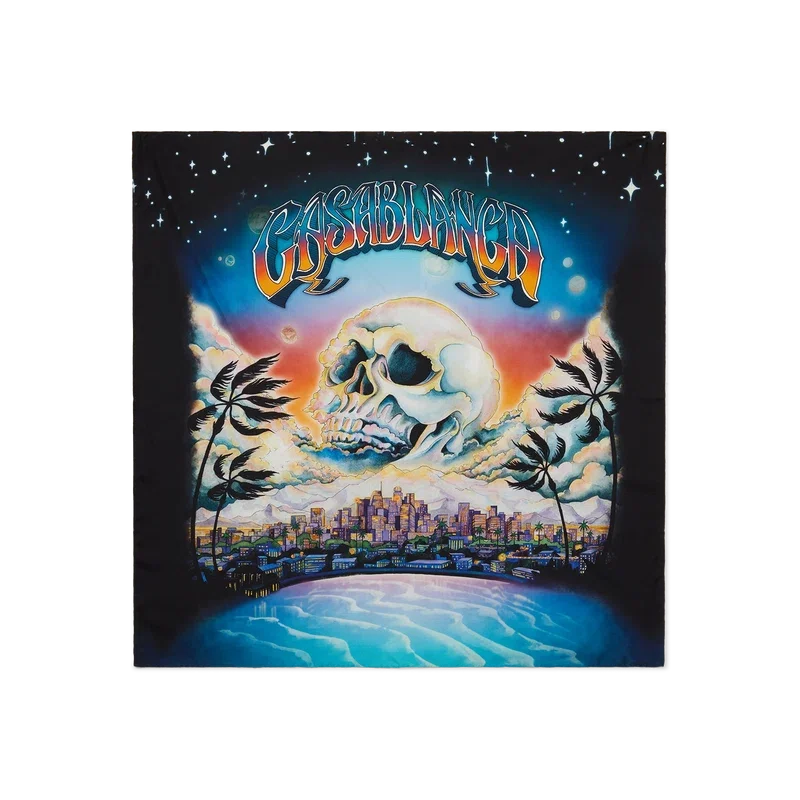 La sciarpa grande in seta La Pramonition presenta un motivo stampato realizzato in twill di seta con l’opera d’arte stagionale della Maison raffigurante una visione inquietante dello skyline di La di notte, con elementi UFO che richiamano l’ispirazione fantascientifica vintage. Rifinita con un bordo nero.