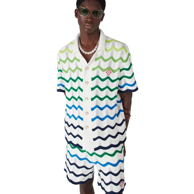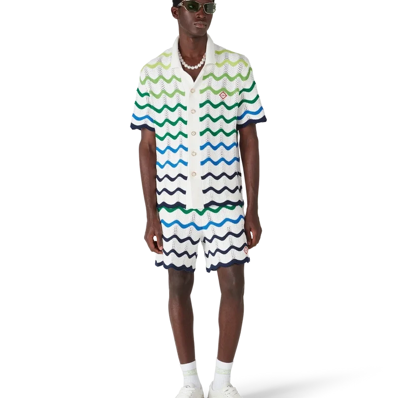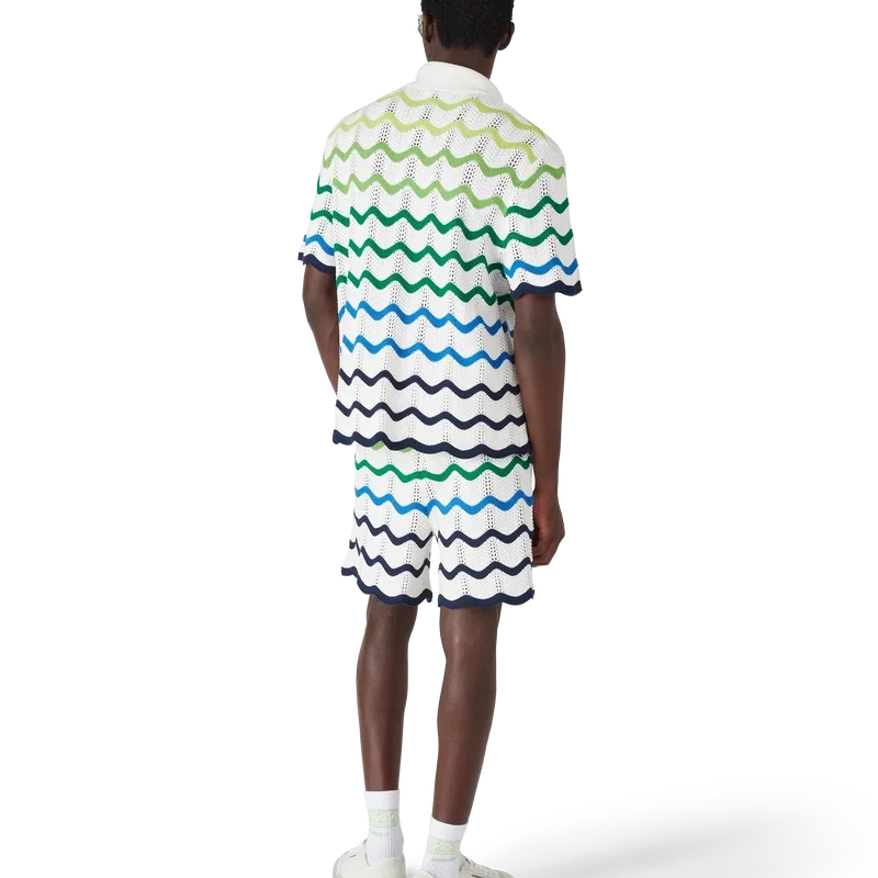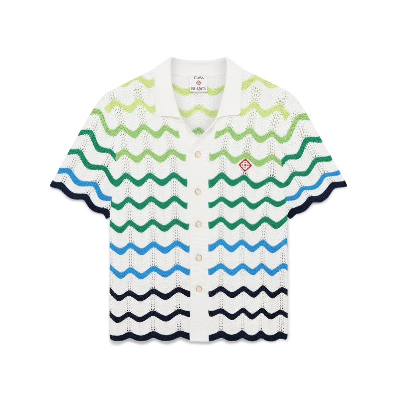 La camicia in maglia Wave presenta un design raffinato, realizzata in tessuto di cotone all’uncinetto a trama aperta con la sfumatura a maglia di stagione. Completata da chiusura con bottoni, silhouette con colletto alla cubana e maniche corte, dettagli con bordi a costine e i caratteristici bottoni in oro con perla e logo a diamante della Maison.