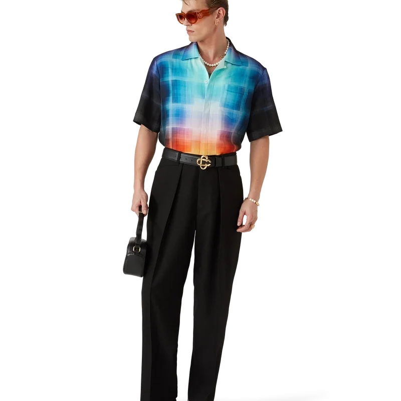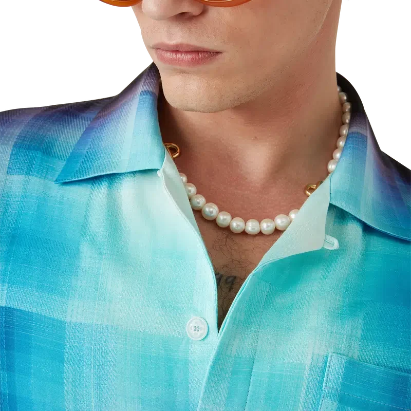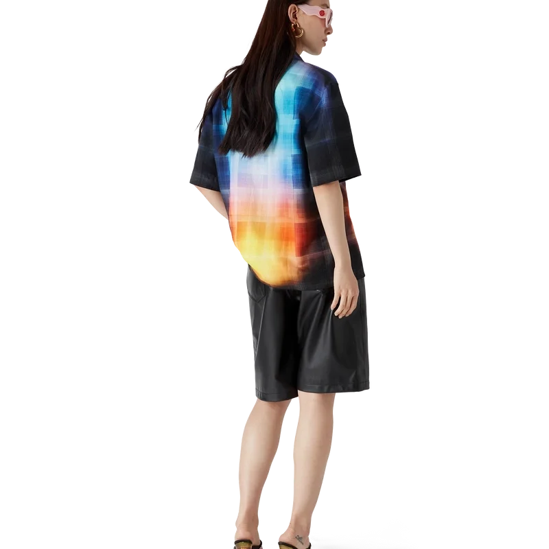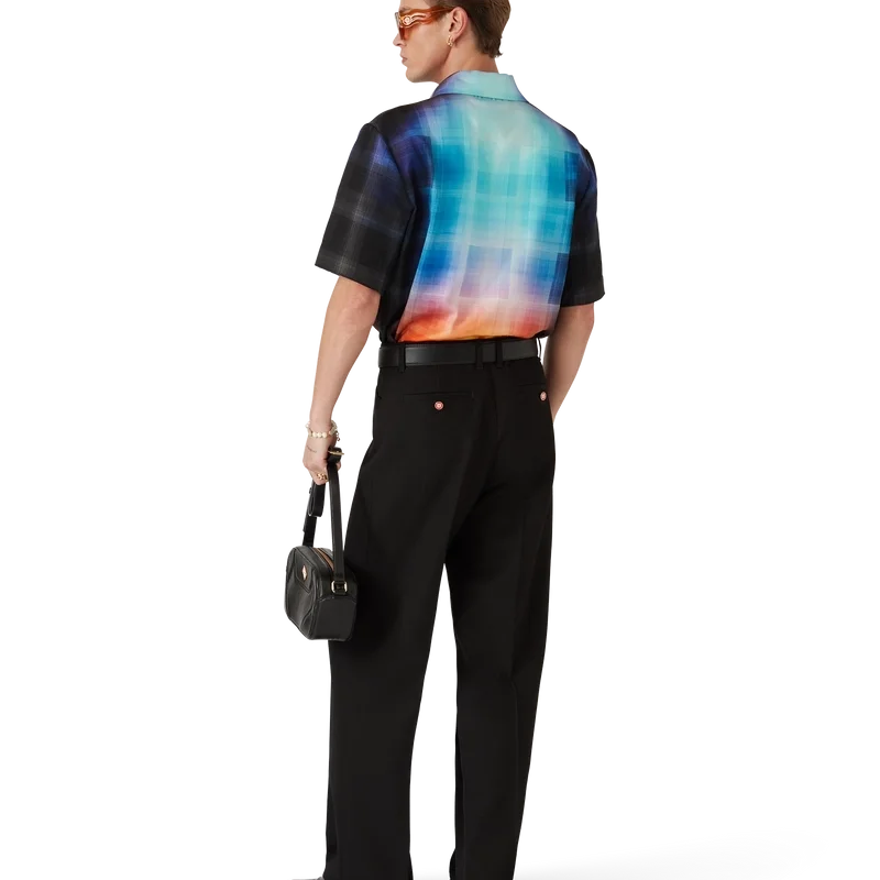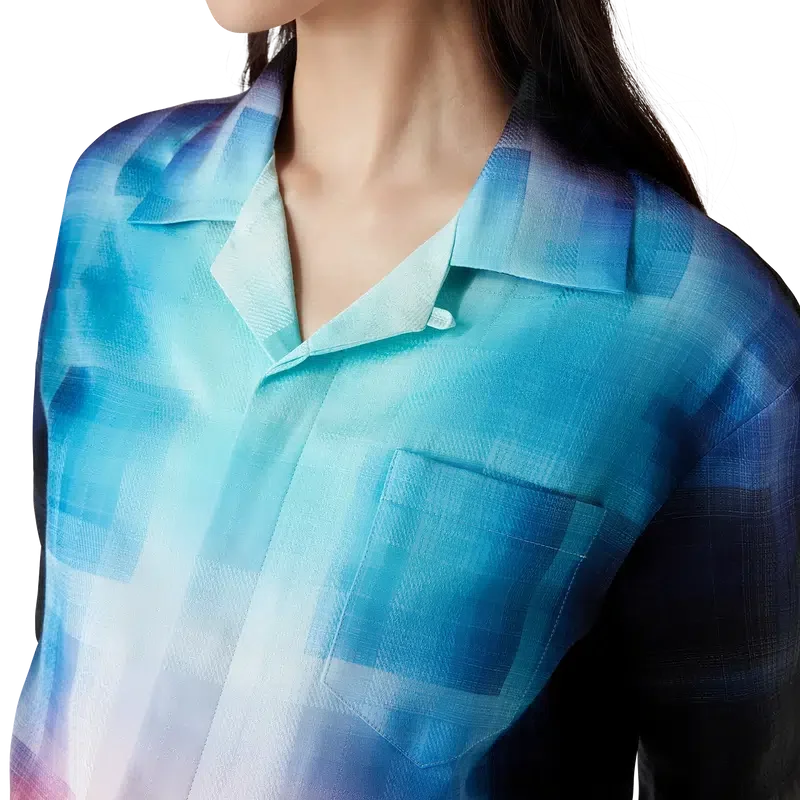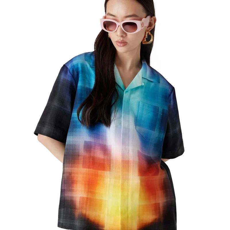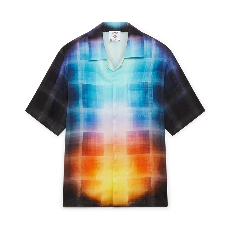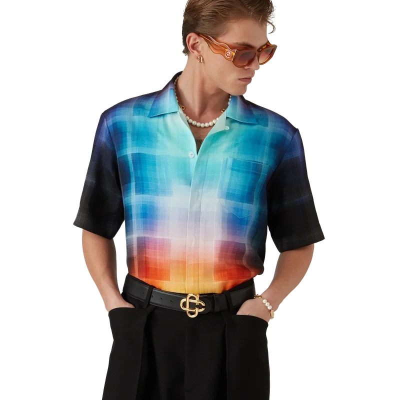 La camicia a quadri sfumati presenta un motivo stampato con i colori sfumati di stagione, realizzato in tessuto misto cotone con motivo a quadri. Rifinita con colletto cubano, taschino sul petto, chiusura con bottoni nascosti e bottoni in corozo con logo Cc intrecciato.